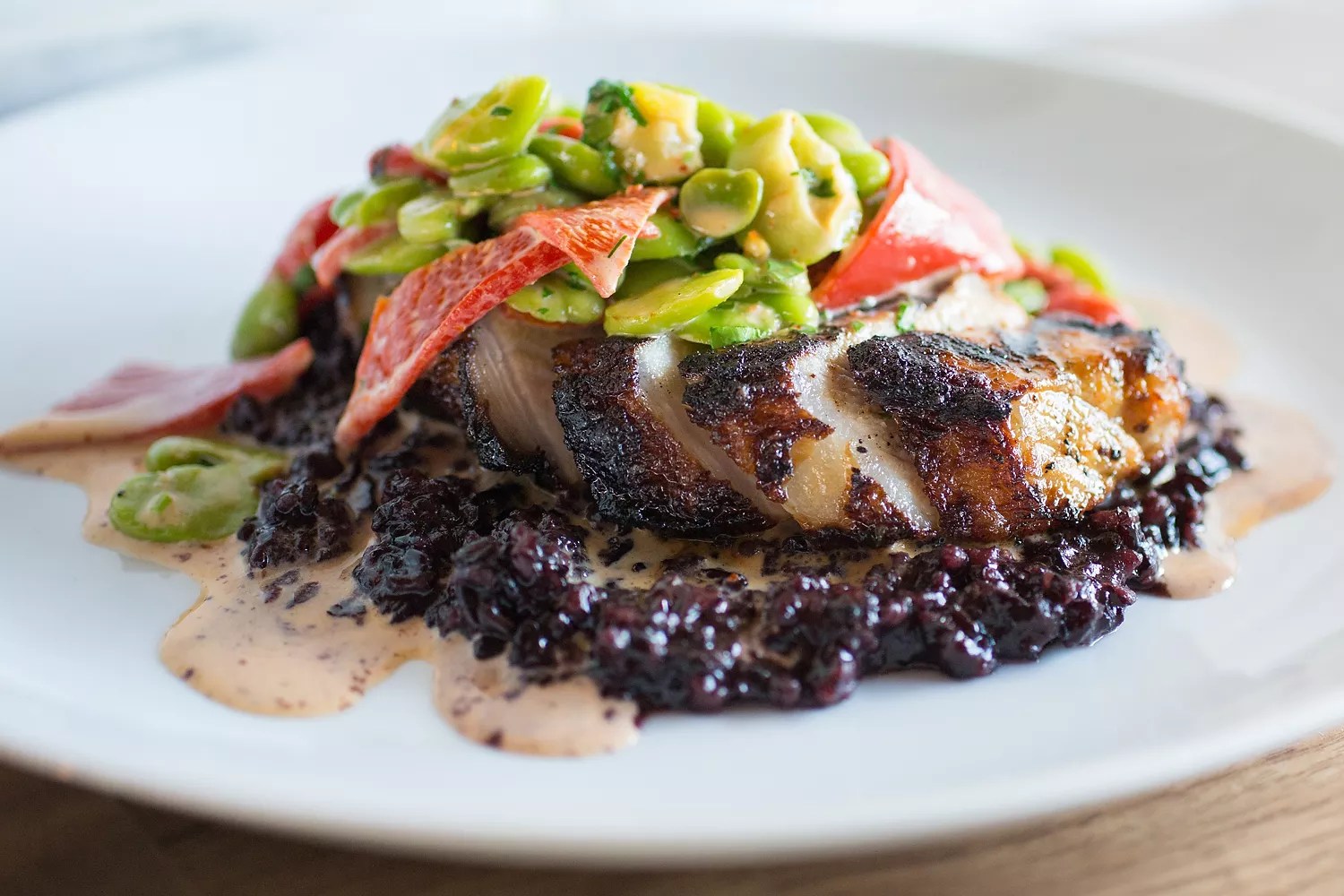 Duroc pork loin over Venetian black rice with fresh fava beans.