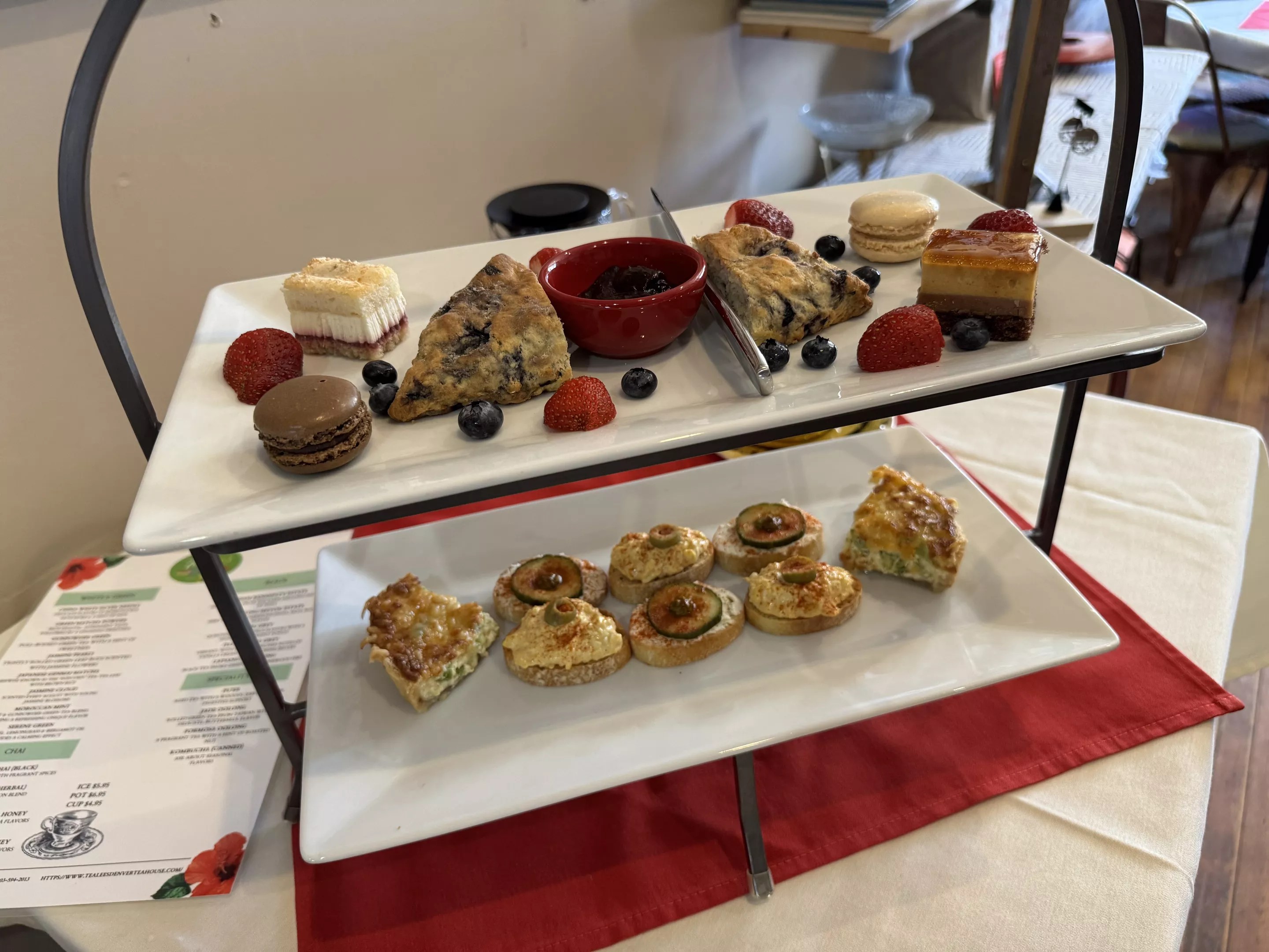 Many customers also order the afternoon tea, which includes three egg salad crostinis, three cream cheese cucumber crostinis, the broccoli quiche, a scone with jam, and a selection of desserts sourced from local bakeries, Whole Foods or Trader Joe’s and served on a two-tiered cake tray. The high tea includes all of that plus a meal. Both come with bottomless tea.