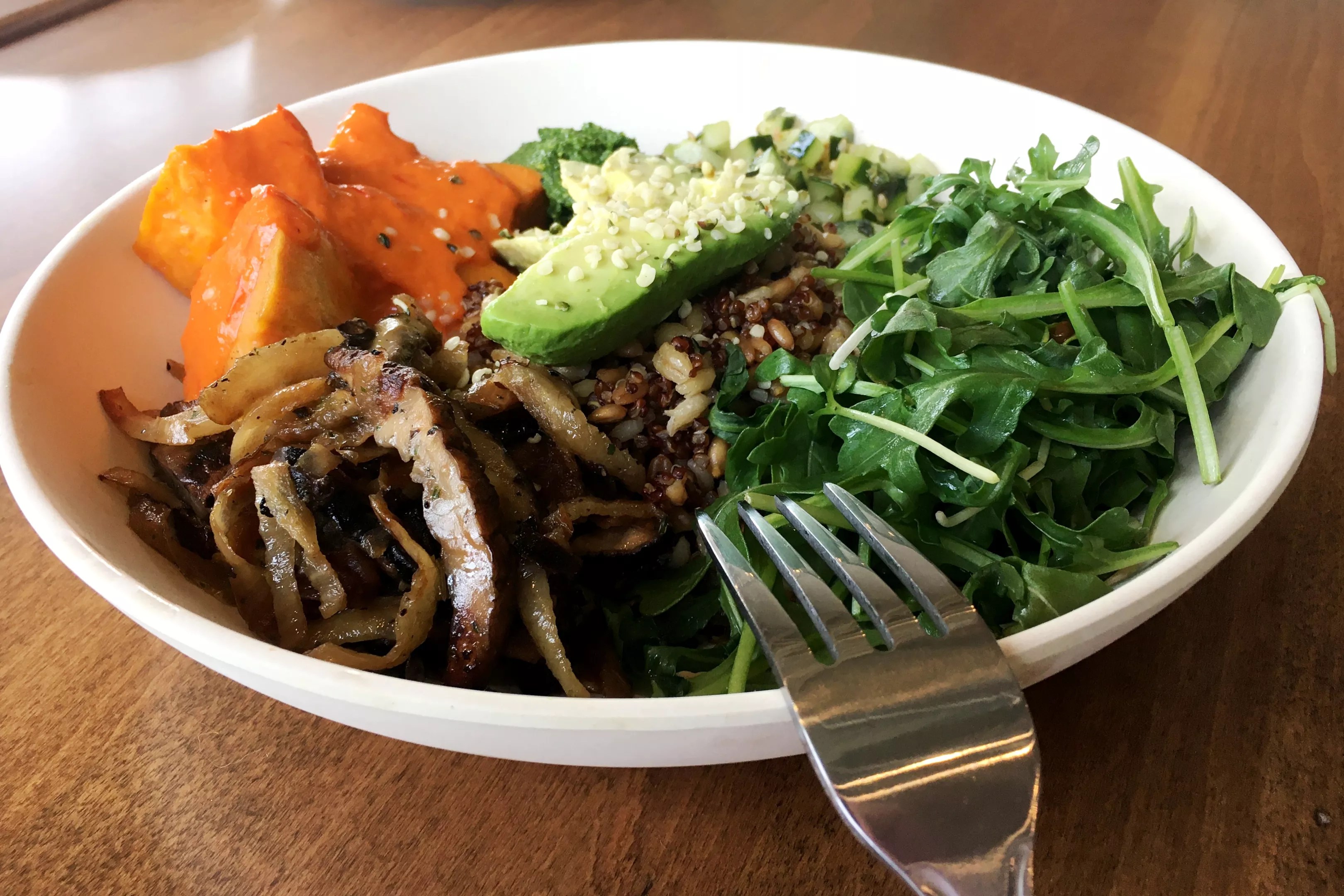 The Mother Earth bowl includes ancient grains, sweet potatoes bathed in red pepper and miso vinaigrette, hemp seed and other veggies.