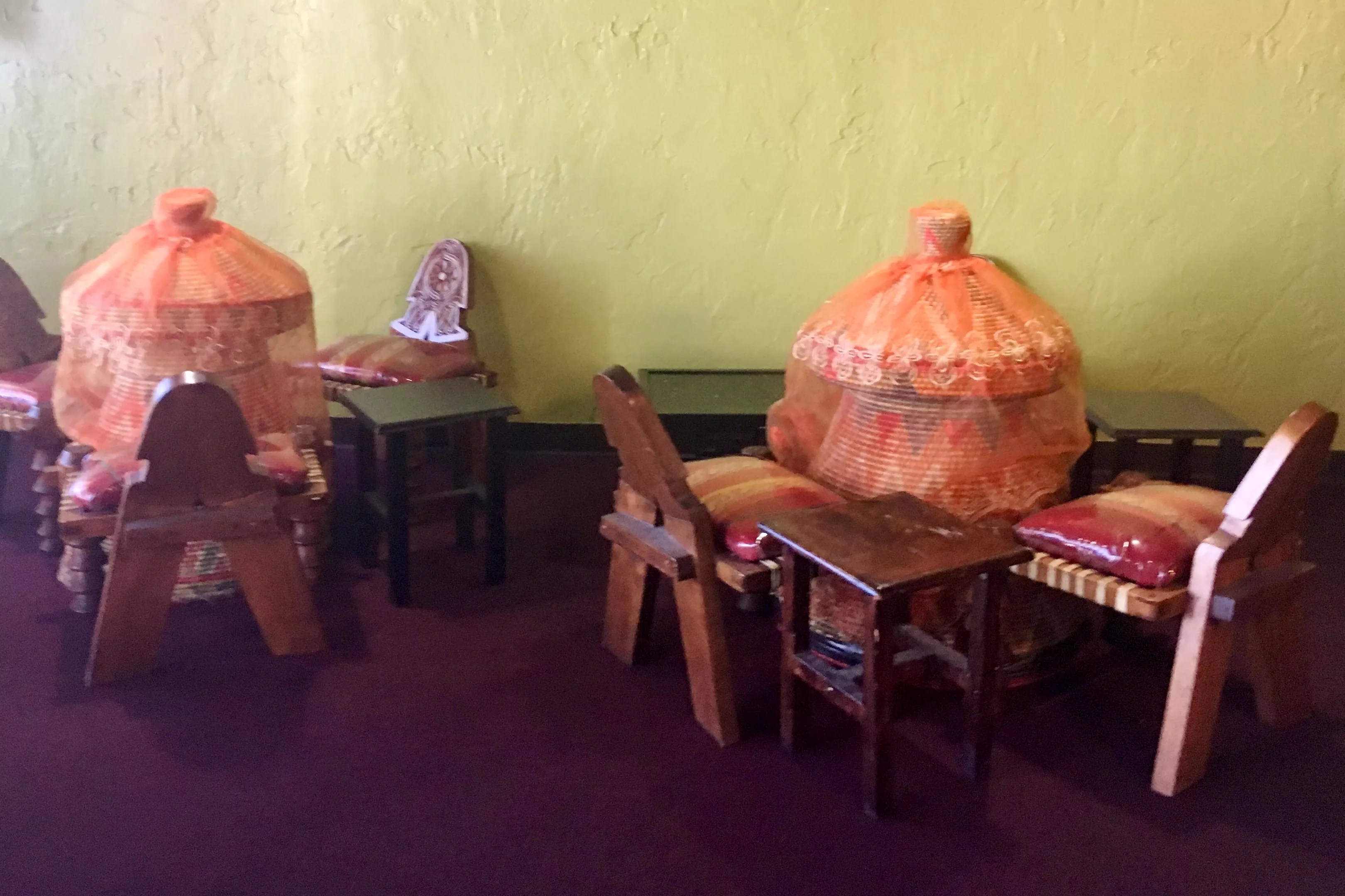 Traditional basket-style tables (called mesobs) dot the dining room, and beautiful art featuring the people of Ethiopia hangs on the walls. The smells of turmeric, cumin and cooking meats permeate the room, foreshadowing the lavish, authentic meal that awaits you. One visit is enough to observe that the Nile has become a gathering place for all: vegetarians, Ethiopian-food virgins, marrow-sucking carnivores and Ethiopian natives looking for a taste of home. This was to be only my second time experiencing the cuisine, so I fall in the (almost) Ethiopian-food-virgin category. Because of that – and hoping to avoid looking like a complete ignoramus – I did a little research on how to eat the food and what kind of foods would be served.