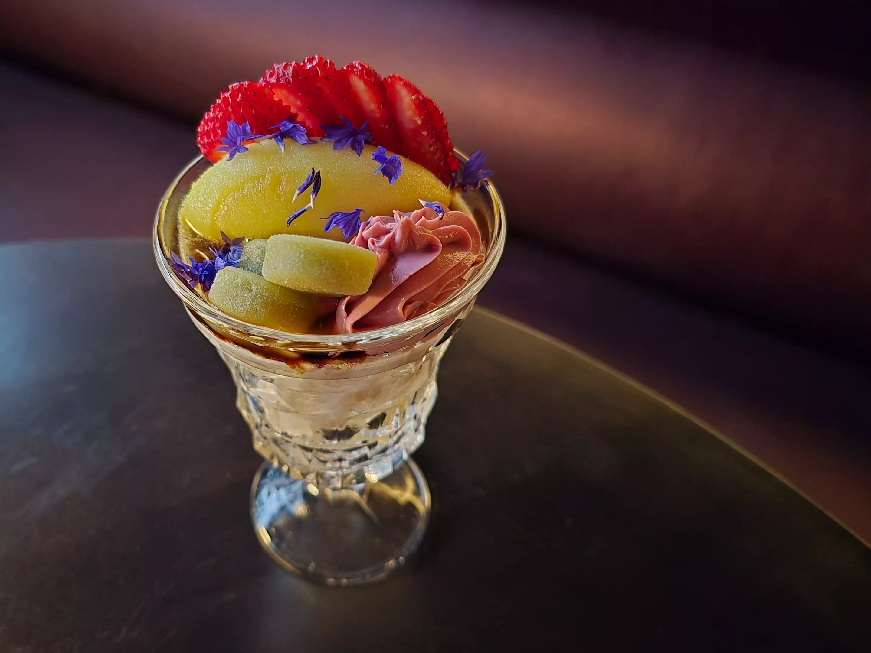 The colorful ingredients are layered artfully in a glass, and “the flavors are all complementary, balanced and not overly sweet,” Baker notes. “Starting from the top, there are juicy strawberries, a lightly sour shikuwasa sorbet with hints of orange, [and] azuki red bean chocolate mousse that is earthy and smooth, diving past the black-sugar syrup through a coconut tapioca with larger pearls of creamy delight, even deeper to the bottom of the dish with perfectly cut small cubes of aloe gelée that will jump around your mouth and chase the flavors.”