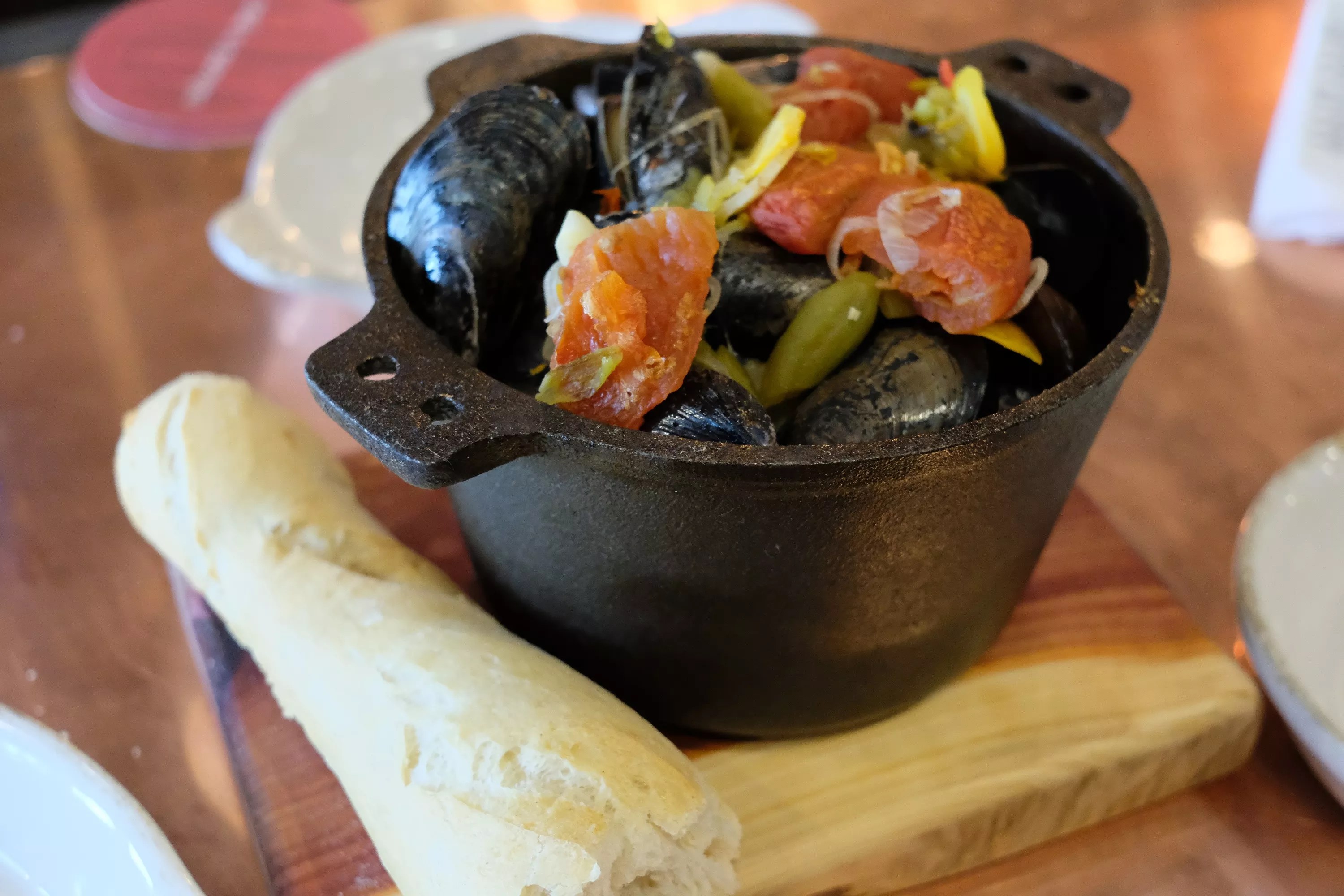 The mussels are served in a cast-iron pot with housemade bread.