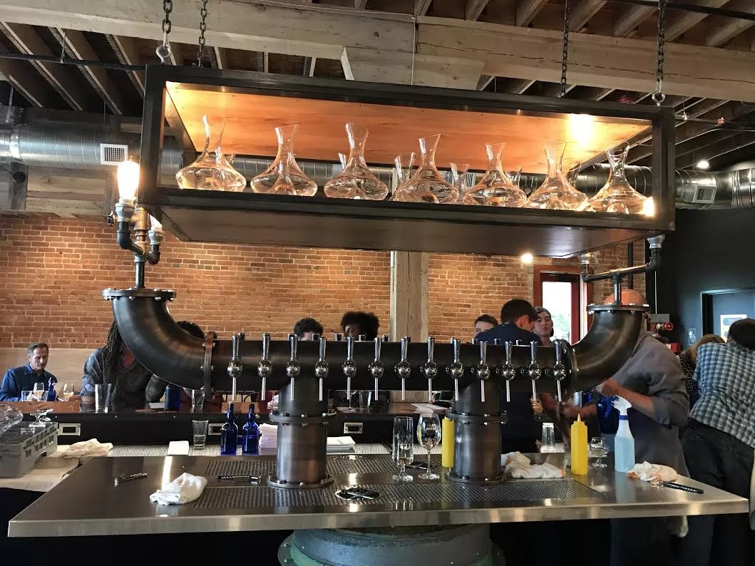 Set inside a 120-year-old brick building with a carefully restored 1930s-era mural on the side, Goed Zuur, which means “good acid” in Dutch, boasts an interior look best described as Steampunk meets European chic. Long tables with elevated platforms for meat-and-cheese boards run along one side, while an artsy clock covers an entire wall on the other. In the middle is a copper-topped bar and custom draft tower made of industrial pipe, wood and lightbulbs.