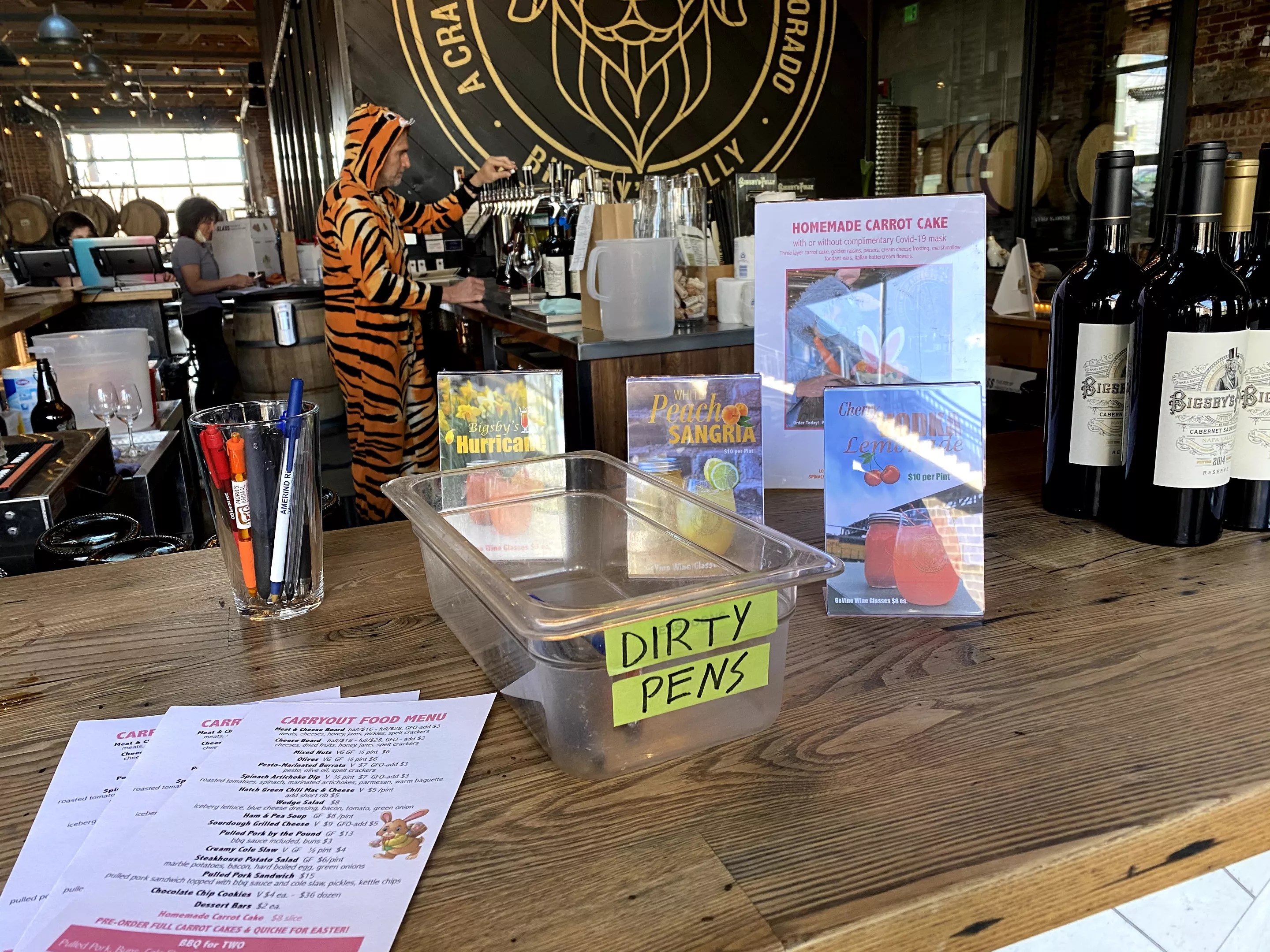 Under normal circumstances, an early evening at Bigsby’s Folly Craft Winery on a brilliant sunshiny week would be a matter of course. But things being as they are, the next best alternative is the urban winery’s takeout specials. Along with wine growlers (which are 25 percent bigger than a bottle) and a live Instagram happy hour every Wednesday, Bigsby’s Folly prepares some of the most delightful food I’ve had in Denver. Could it be the comfort food-craving, pandemic-weary soul in me talking? Could it be the joy of beholding a man in a tiger suit handing me my order? Yes to both (and I think you’ll agree).