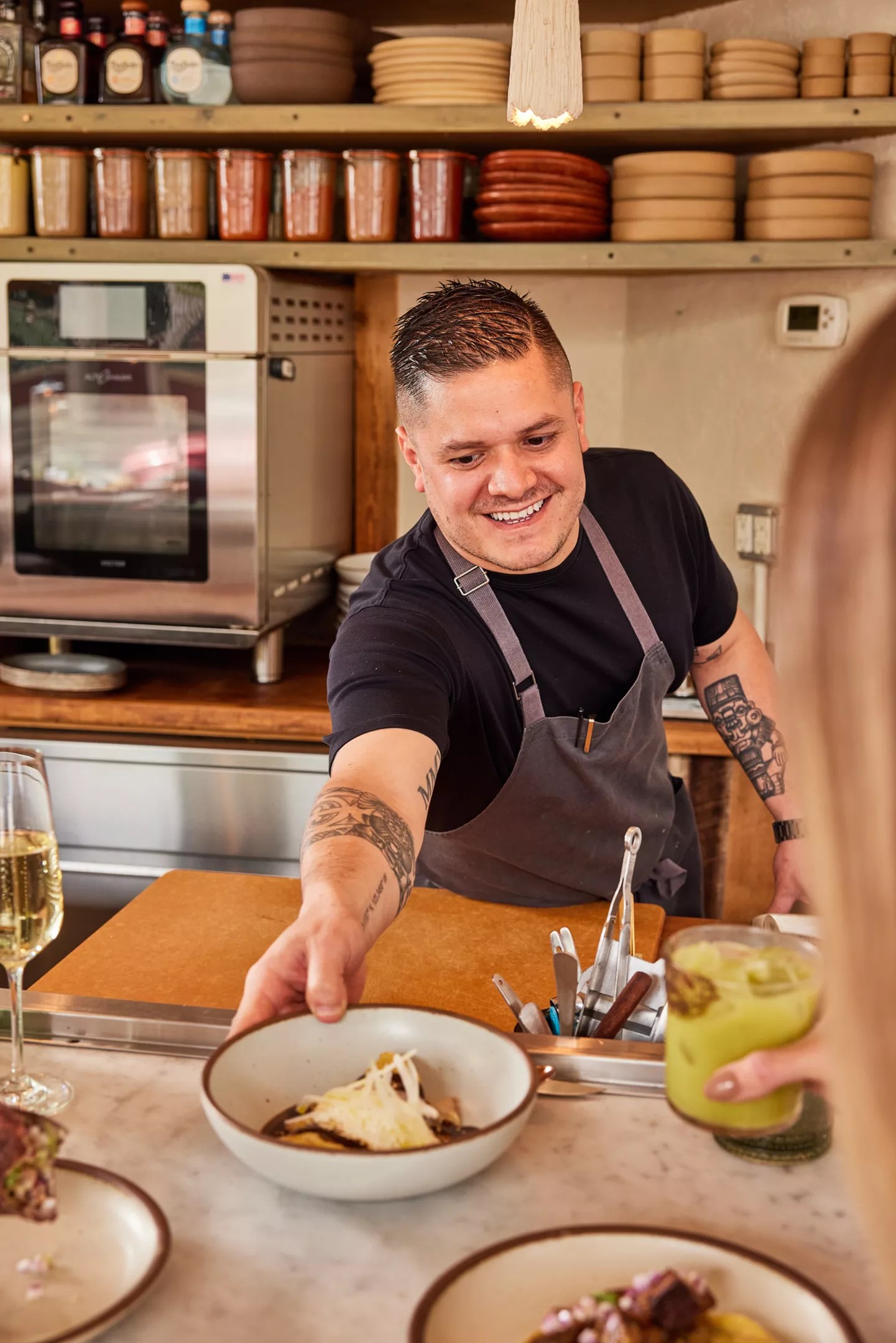 Johhny Curiel serves food at the chef’s counter inside Alma Fonda Fina.