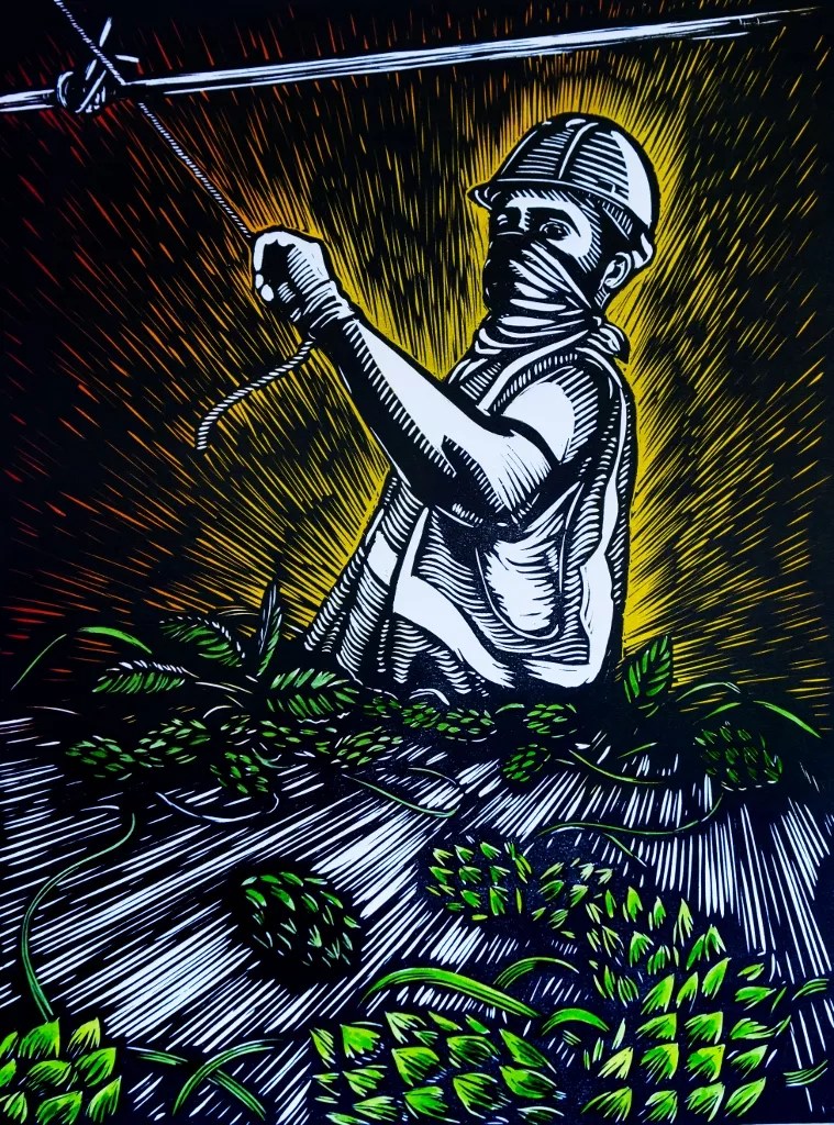 The reason that I gravitated to create prints of Mexican farmworkers is because I have always felt that there has been a disconnect with the idea of the physical labor that goes into growing and harvesting a crop and the commercialization and consumption of the final product. People can go to the grocery store and buy their veggies and sauté them to make an extravagant dish, and they thank the chef/cook for crafting it. The same thing goes for hops and other agricultural-related industries. You drink your beer and appreciate the combination of flavors and aromas that go into crafting an exquisite beer, and you can applaud the brewers for creating such a wonderful concoction. However, how often do people think about all of the “other” hands that these cones, veggies or produce had to go through in order for them to make it onto your dinner table? How many thanks have been given to the land, the plants and the people who cultivate and harvest these creations in order for us to consume them? How often do we thank our nation’s farmworkers for the work that went into planting the crops, training them to go up and around the trellises, and making sure they are watered? How often do we thank the farmworkers for harvesting this produce during downpours, record-breaking heat, wildfire smoke or even during a pandemic? Not often, because not everyone is exposed to these realities. And this is one of the main reasons I create – to get people thinking about realities outside of their own.