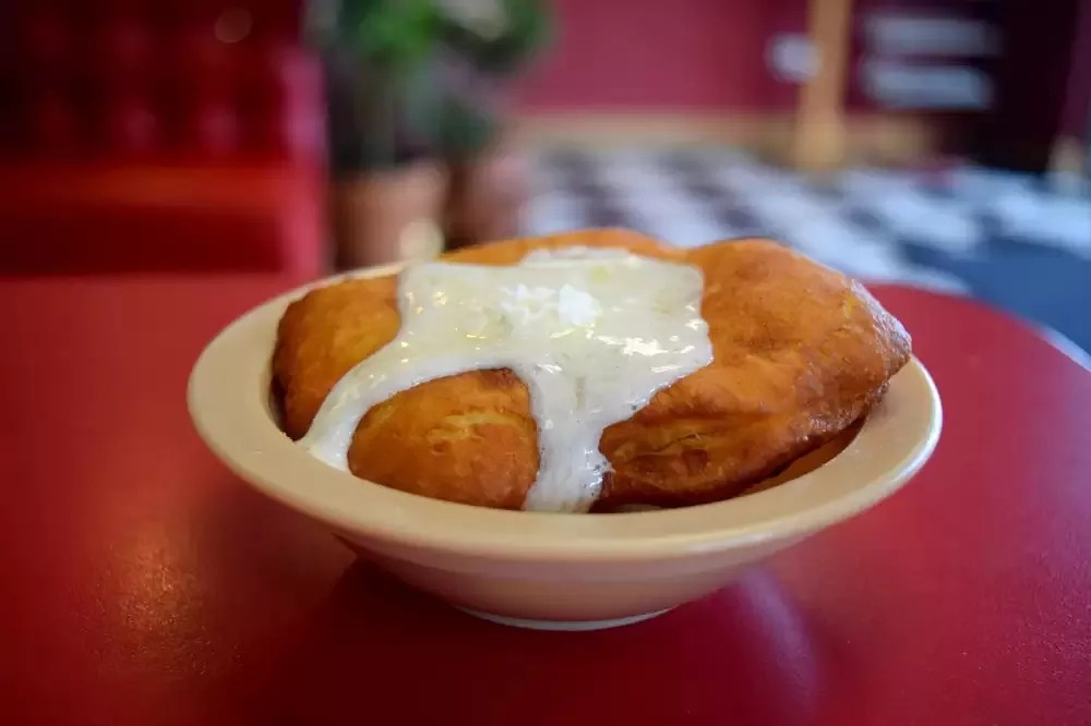 What you’re eating: The Utah Sconut. The only dessert on the menu at Jabo’s, the Sconut ($2.50) is a contribution from Lawson’s wife, Susan, who has decades of experience in hospitality and deep family roots in Utah. While a scone is typically a dense quick bread, often served with tea or coffee for breakfast, a Utah scone is a deep-fried delight.