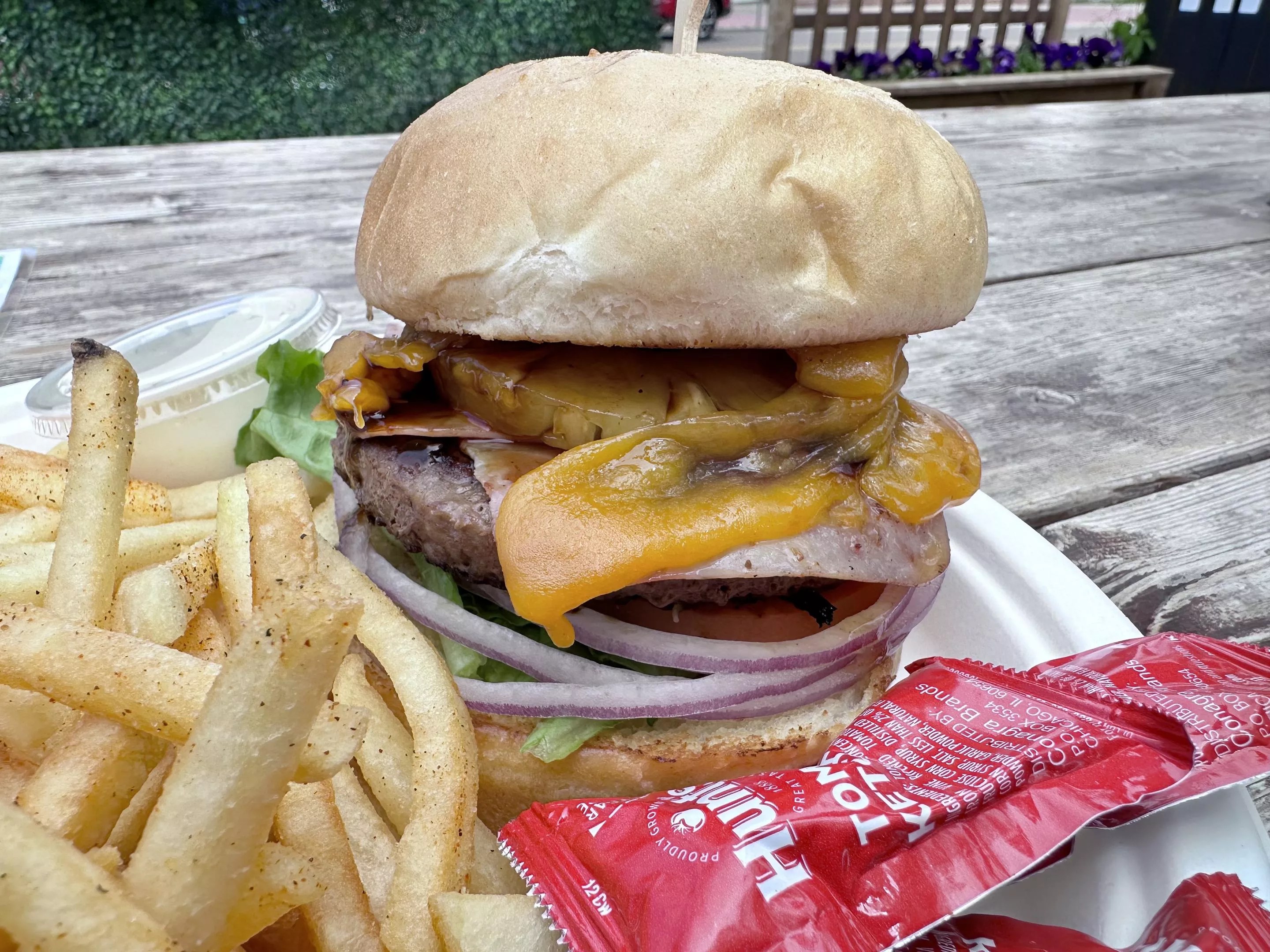 The Hawaiian Burger from Jalapeño Business with pineapples and teriyaki sauce.