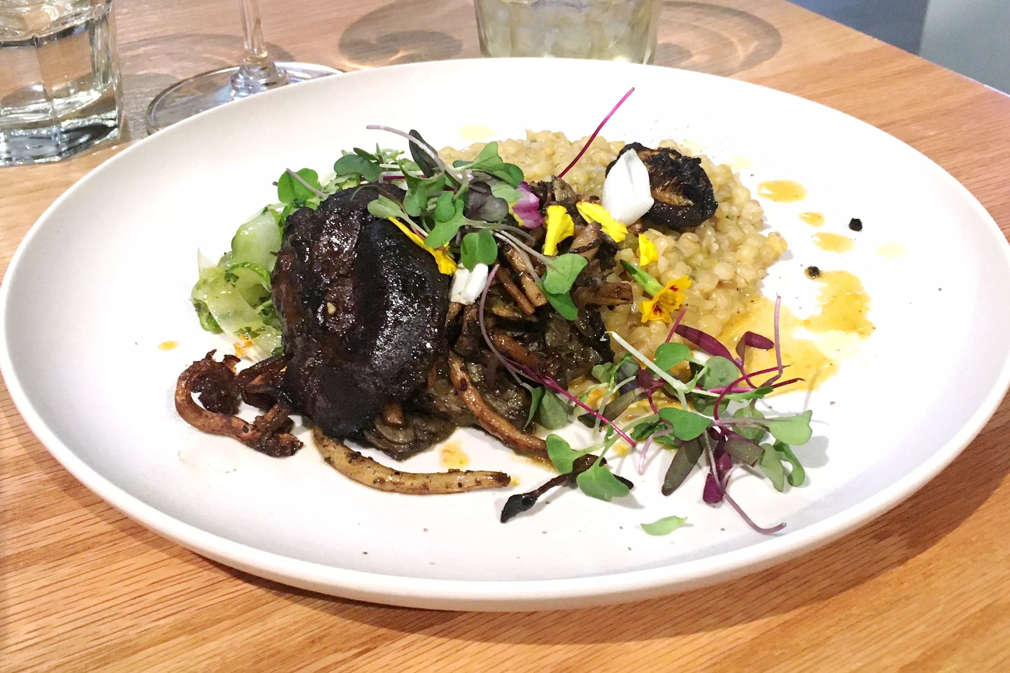 Taj Cooke’s vegan jerk mushrooms with cucumber and risotto made from heritage Sonora wheat.