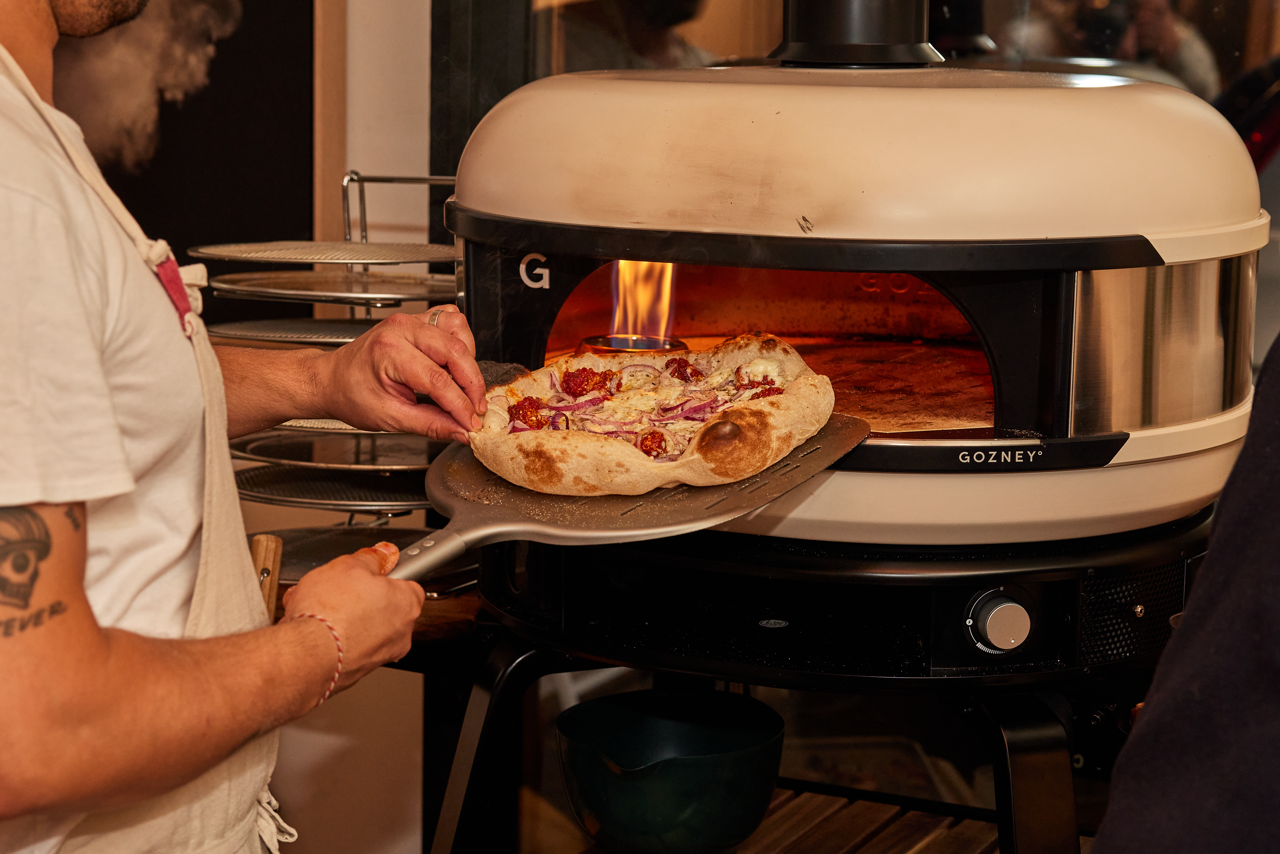 Justin Freeman cooking in the portable pizza oven that Monarch will use for pop-ups as it looks for a permanent space.