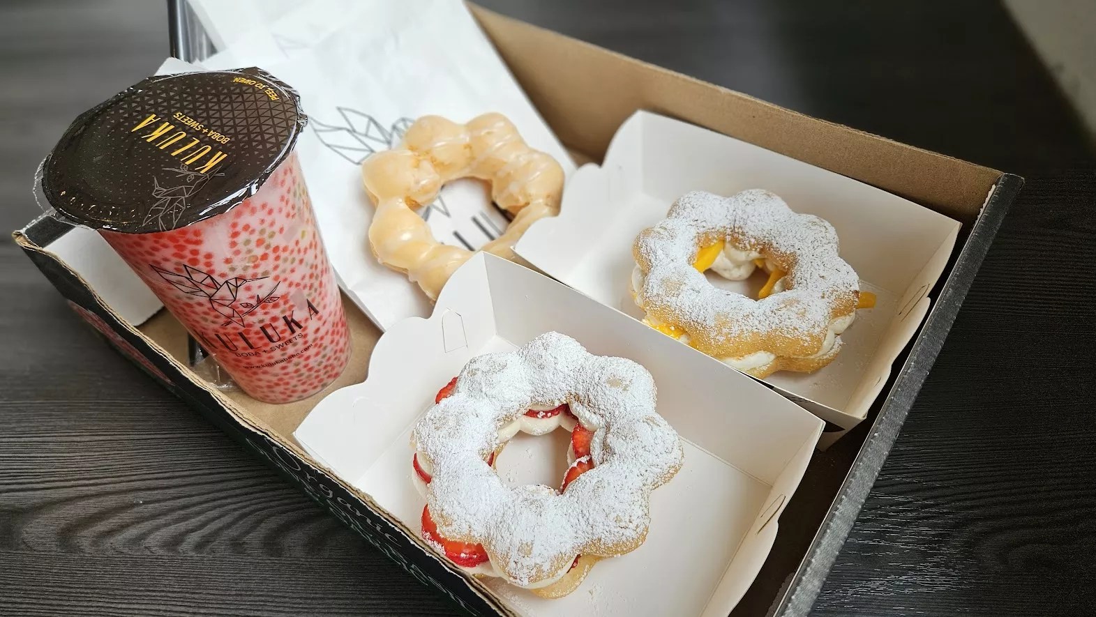 In the midst of utter suburbia, half a block from a Costco in a building that once housed a Marie Callender’s family restaurant and pie shop, you’ll find Kuluka, an independent, women-owned doughnut and boba shop. Like Mister Donut in Japan, which calls them “Pon de Ring,” Kuluka makes its mochi doughnuts as circles of balls that are easy to pull apart and pop into the mouth.