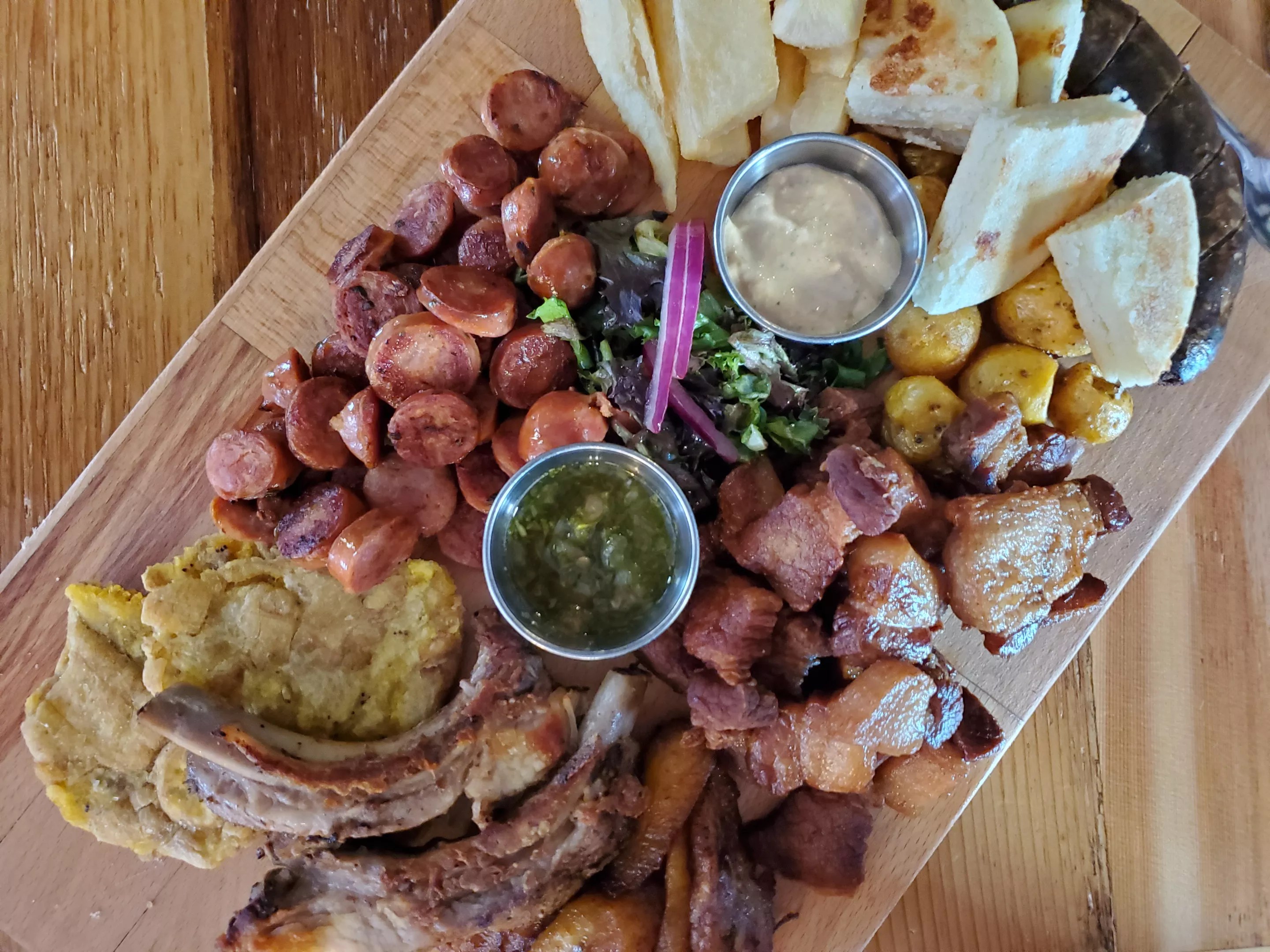 The carnivorous items are accompanied by planks of fried yuca, patacones, papa criolla (small fried yellow potatoes), sweet plantains and arepa. A side of herbaceous aji casero made with cilantro and chiles and a creamy chipotle sauce complete the feast. It’s like a charcuterie board gone fried, in all the best ways.