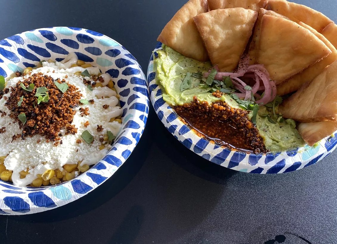 The Mexican street corn bowl and guac with pita chips.