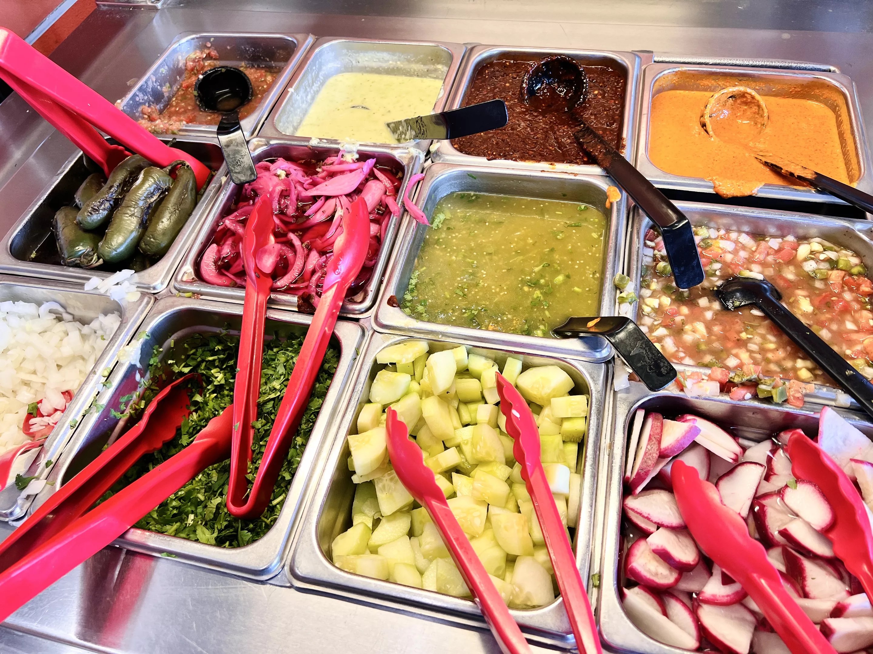Not to be missed is La Perla’s self-serve salsa bar. Staples like chopped cilantro and sliced radish are available; however, the real stars are the freshly made salsas and pickles. A dash of the fiery, orange-hued hot sauce will surprise even the bravest of heat seekers, while the tomatillo-avocado salsa cools things down a notch. Pro tip: Skip the plain diced onion and reach for the pickled onions instead. Tossed with habanero chiles and oregano, these ruby-red slivers pack the perfect acidic punch.