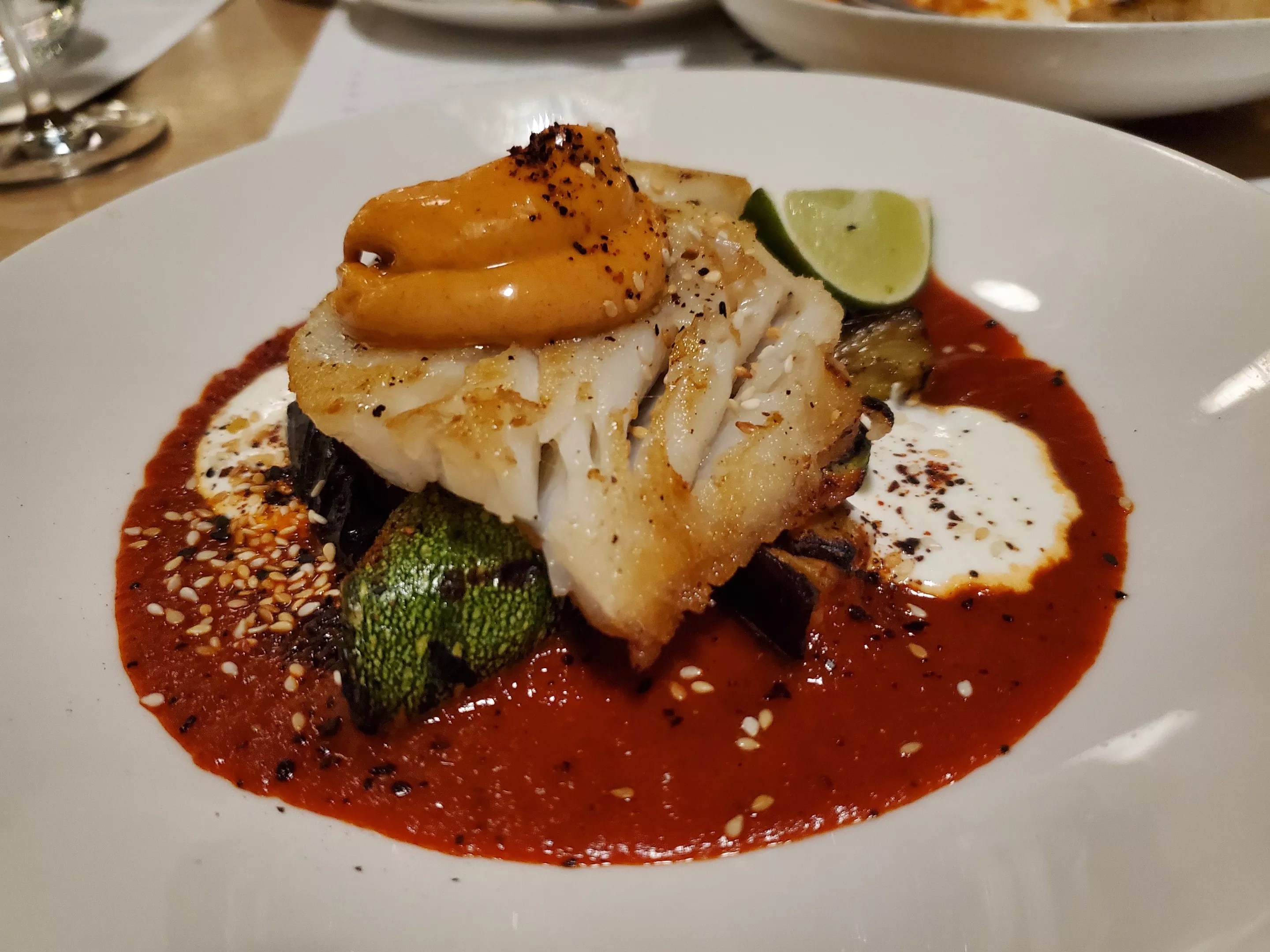 Tomatoes are prevalent throughout as well – not just in raw form, but in various sauces, like the plum tomatoes in the lobster broth for the busiate; preserved tomatoes in the eggplant puttanesca pappardelle; and the deep, smoky, tomato-based sauce for the cod, which also has guajillo chiles.
