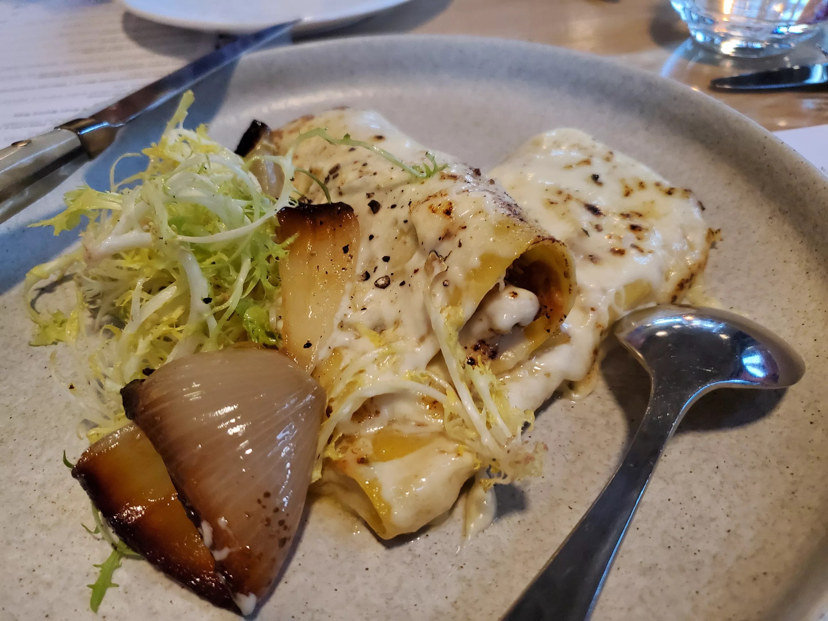 The new dish, rabbit cannelloni with poblano and smoked cheddar melted on top, was inspired in part by cannelloni that the chef ate in Tuscany, as well as a rabbit roulade she used to make. The result is a rich, baked pasta dish that maintains just enough summery lightness, thanks to the addition of dressed greens from Altius Farms.