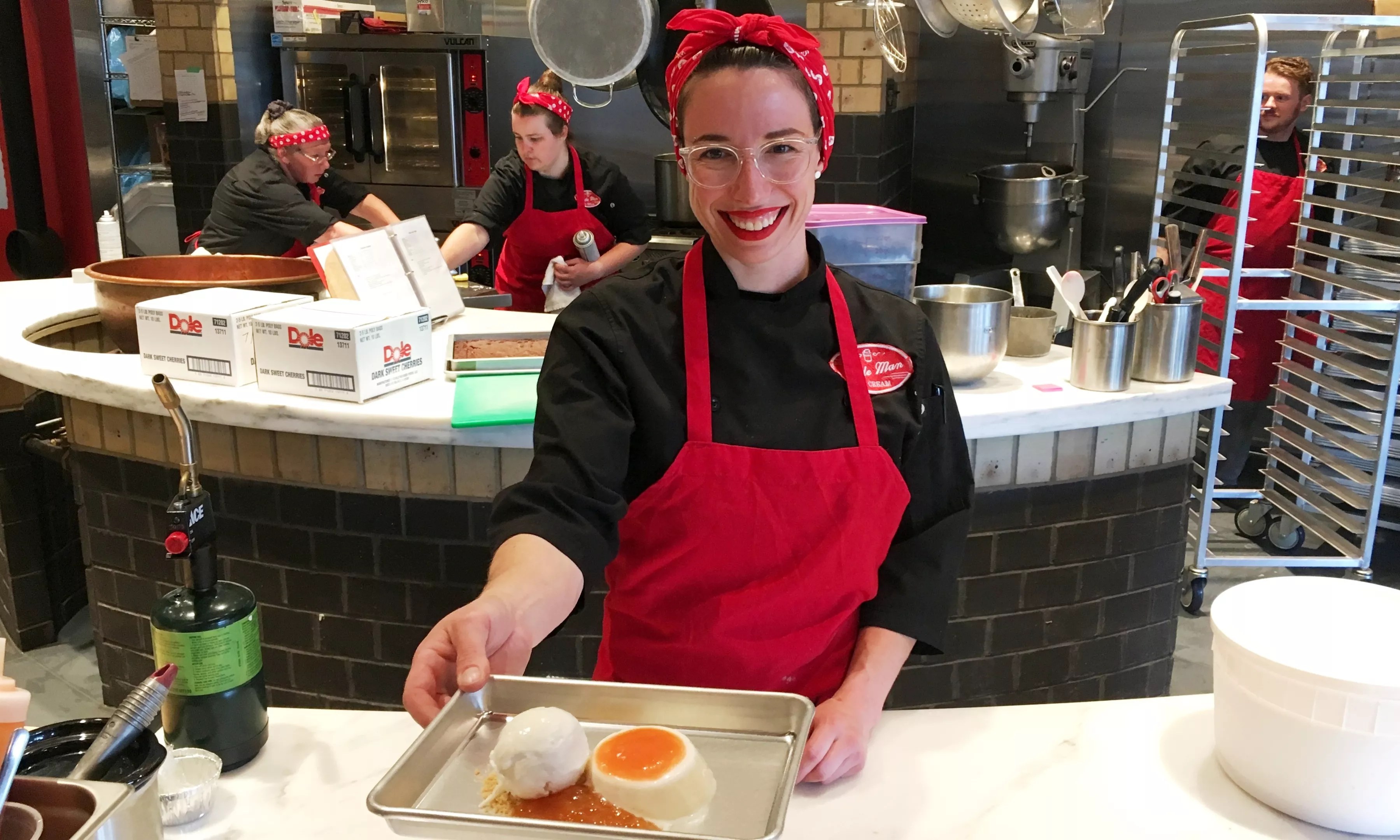 Pastry chefs prep baked goods and other ingredients on the menu.