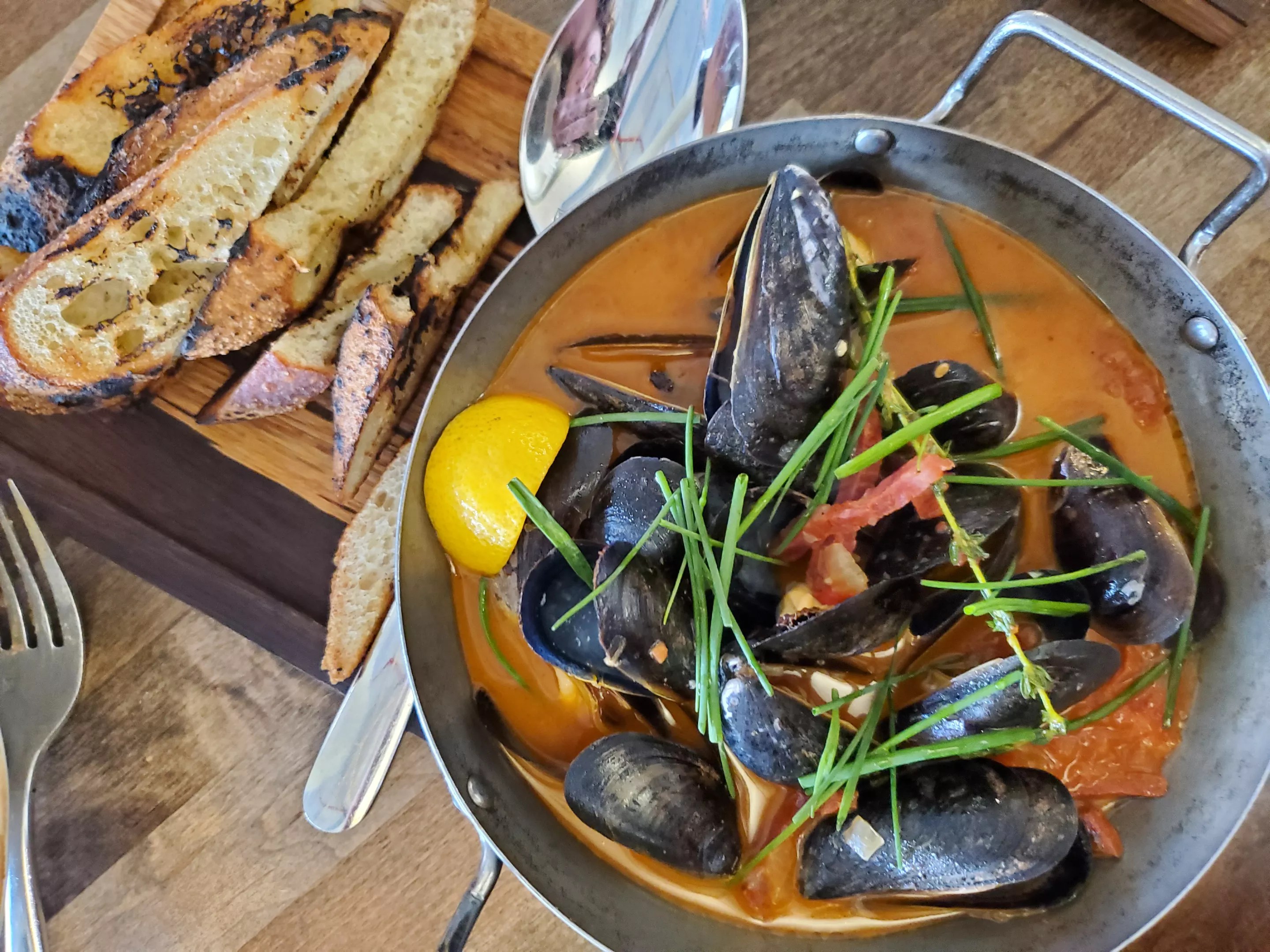 A pan of P.E.I. mussels ($18) landed along with plenty of charred, chewy bread to dunk into its tomato-studded broth filled with plentiful chunks of Spanish chorizo. Despite plans to pace our eating, we devoured the entire serving, soaking up as much broth as possible with the bread.