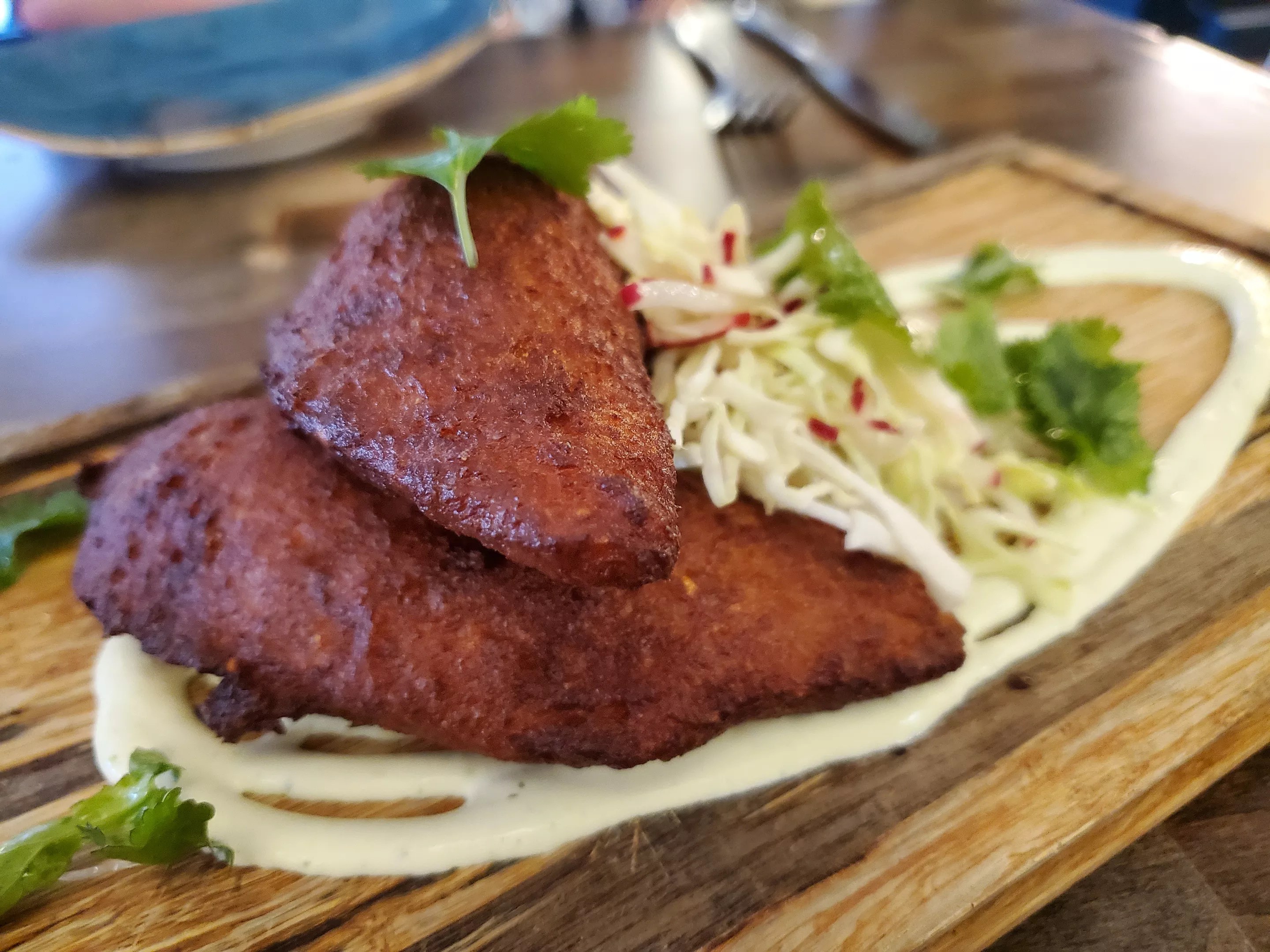 Those three dishes alone would have made a great meal for two, but we were hungry to try more, so we asked Casiano for his recommendations. He steered us toward the alcapurrias ($16), a Puerto Rican fritter of masa made with yucca and taro root that’s stuffed with pollo guisado and fried. The hefty fritters are served with a serrano-spiked crema and a cooling cabbage salad.