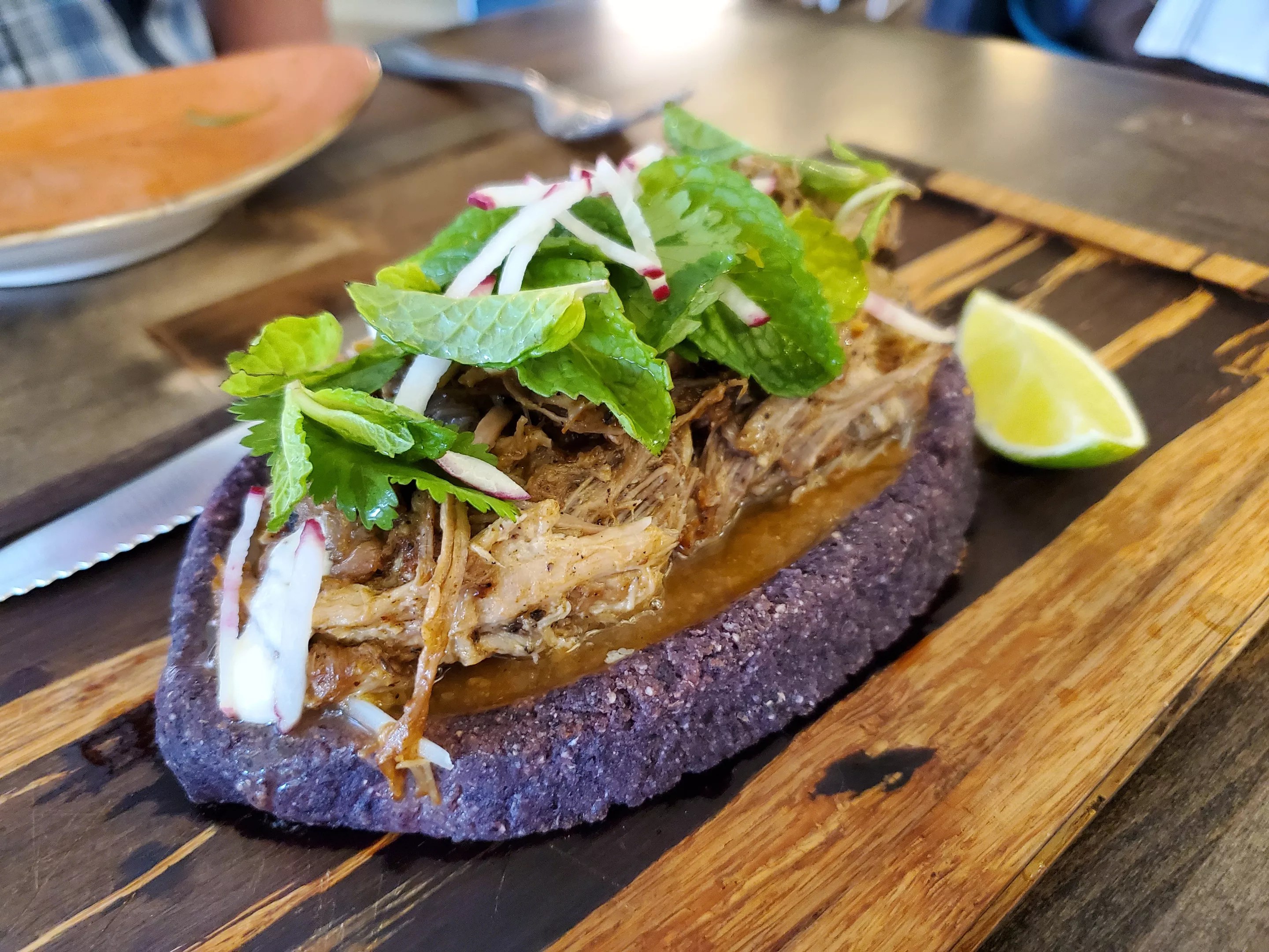 A generous portion of flavorful, slow-roasted cochinita ($18), came next, piled on top of a tlacoya, a boat-shaped vessel made of masa (Lucina uses blue corn), along with salsa macha for a touch of heat and plenty of fresh herbs.