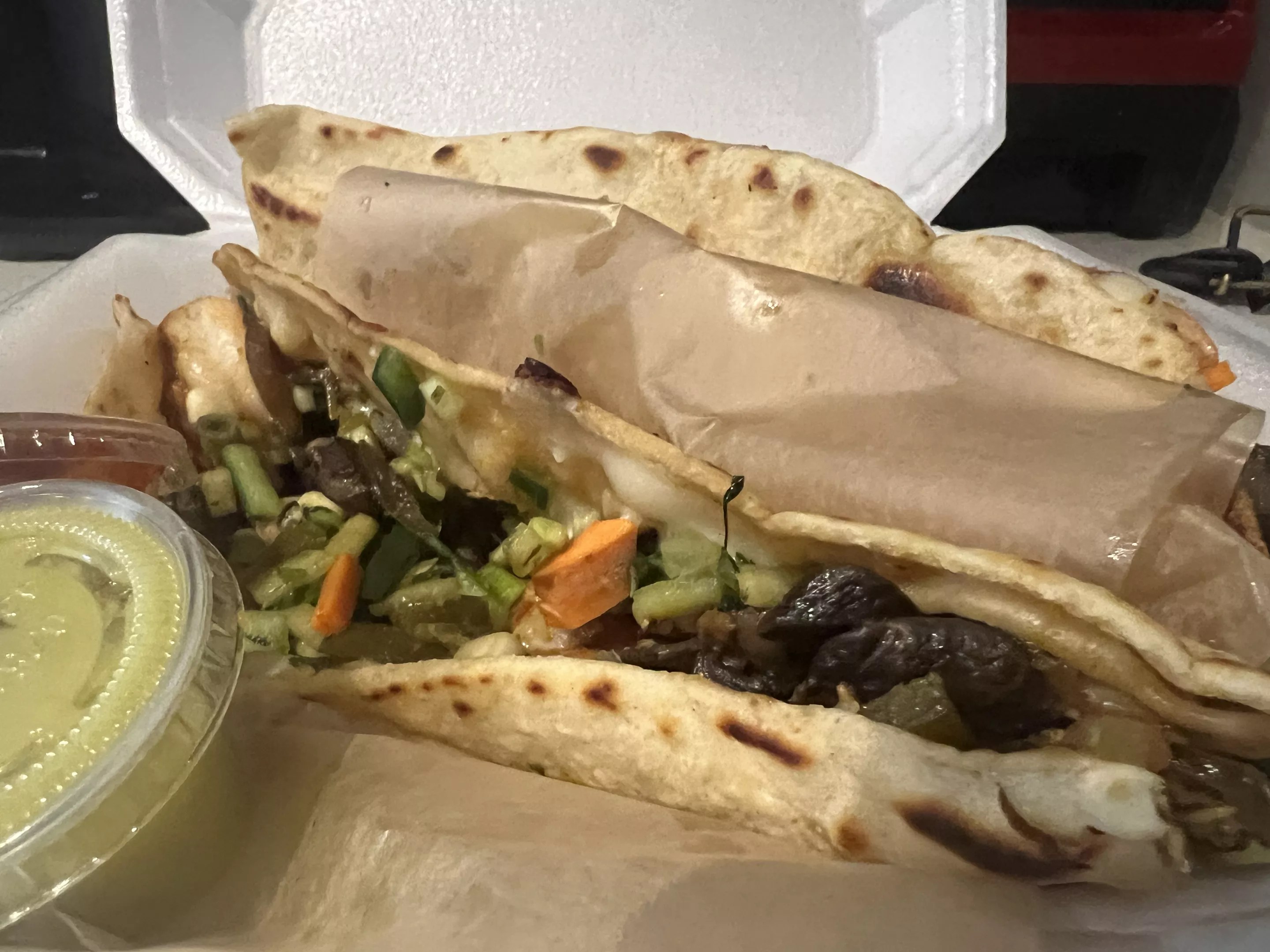 These tasty treats are a regional (in this case, Mexico City) specialty that starts with a long (often twenty inches or more) masa shell filled with goodies. At this size, you can select fillings either mixed together (not traditional, but delicious) or isolated in their own discrete areas. (You want al pastor but your buddy prefers birria? ¡No hay problema!) The whole shebang is then crisped (or sometimes lightly fried) on a flat-top and folded before being sliced and served with the salsa(s) of your choice.
