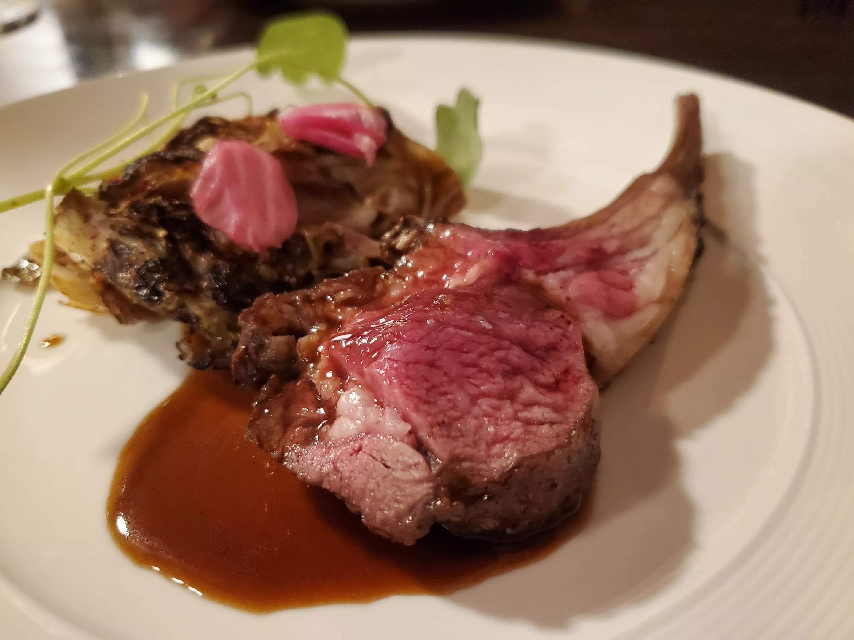 The pan-roasted rack of lamb is the heaviest course of the night, and also one of the most memorable. The meat is perfectly cooked and seasoned, served with a charred portion of castelfranco radicchio, an heirloom winter vegetable from Italy.