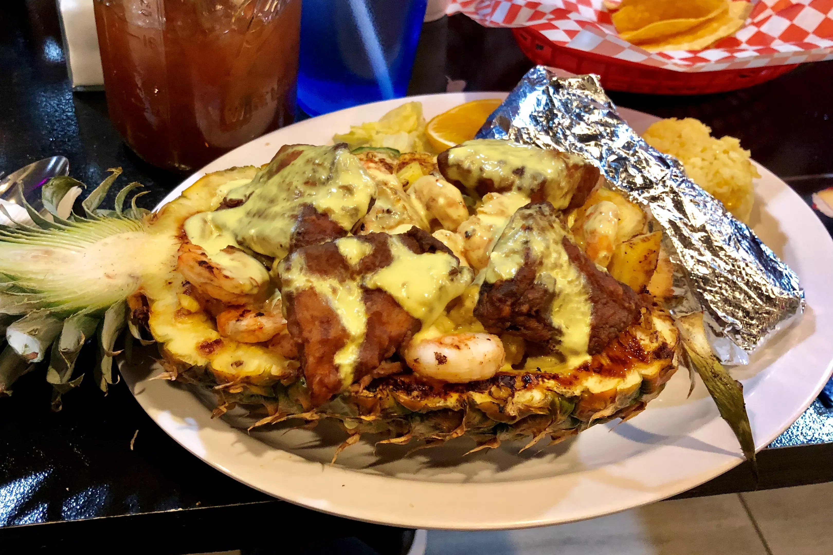 The fajitas mixtas ($17.99) combines tender steak and chicken with whole shrimp; here the meats are piled to overflowing and far more abundant than the grilled peppers and onions that normally overwhelm the proteins at other restaurants. The piña caliente ($14.99), served in a halved, grilled pineapple filled with shrimp and fried pieces of fish, was impressive to look at but was not nearly as tasty as the other dishes. A sharp, Dijon-style mustard sauce drizzled over top was more sweet than caliente and clashed with the already-sweet pineapple. The shrimp were tender, but the pieces of fried fish were extremely dry. Maureen Witten