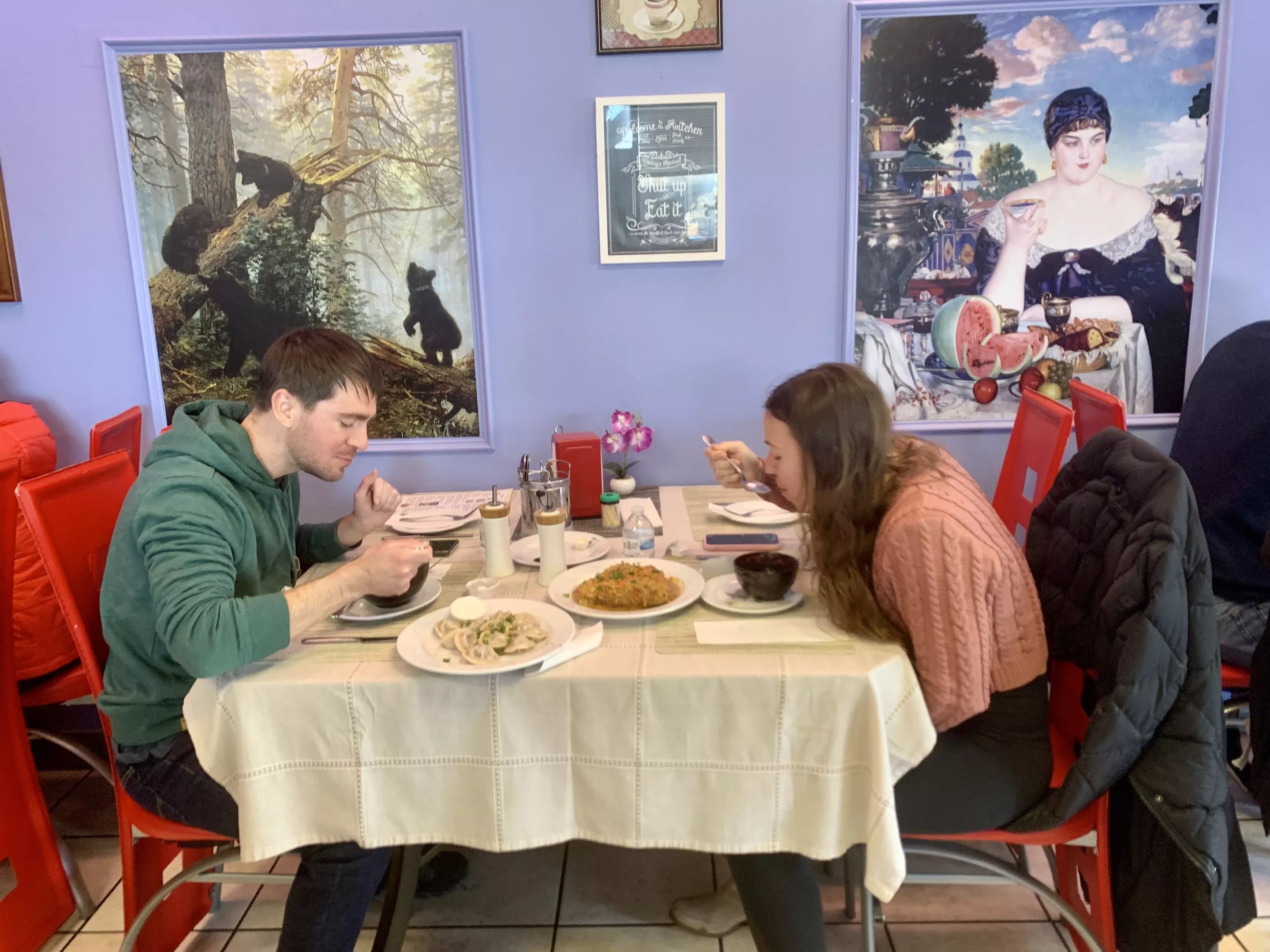 “We are happy a lot of people love our food. Our customers like new Russian dishes, learning Russian culture. All our art is Russian; that soldier on the horse is hanging in a Russian museum,” adds Yatskevich, pointing to one of the many paintings on the walls.