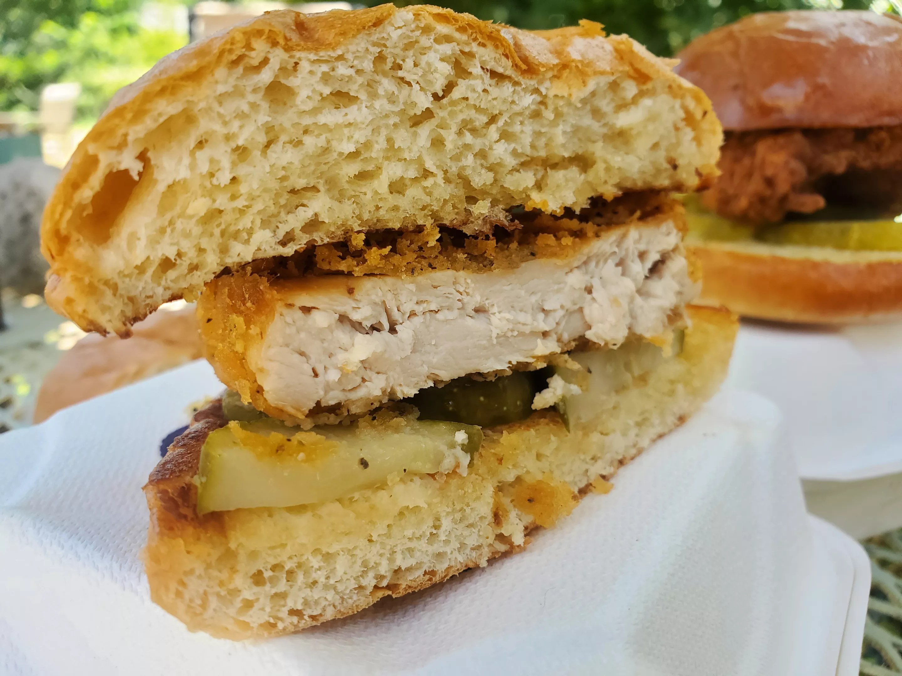 When I sliced the sandwich in half, though, I was surprised by how much it did indeed resemble chicken – at least the kind of processed chicken used in those cling-wrapped chicken sandwiches they seemed to serve at every high school in the early 2000s.