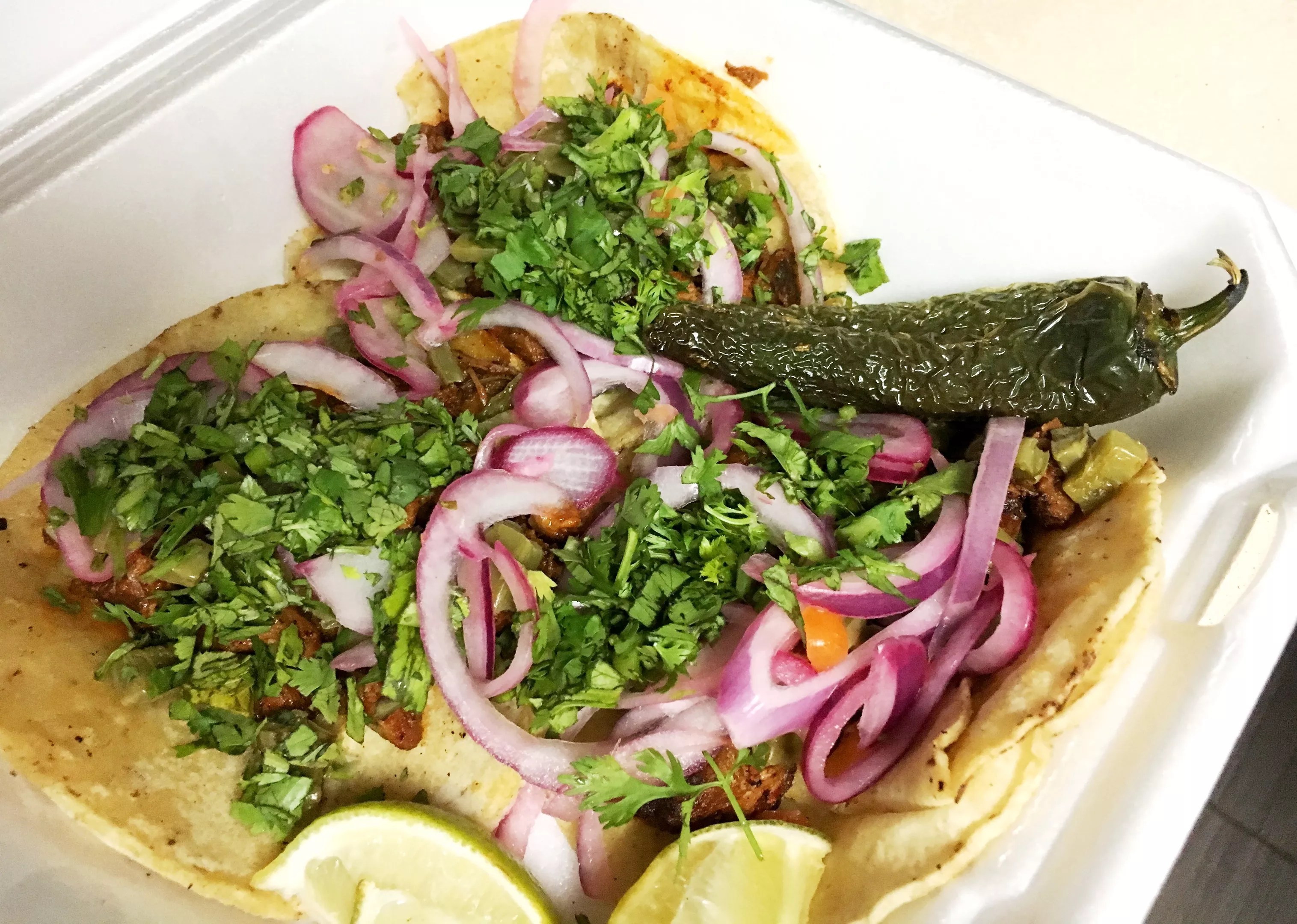 The tacos themselves start with three choices of meat: beef barbacoa (you can request it extra-crispy), pork adobada, and carne asada made with rib-eye steak. Rib-eye is more expensive, so the profit margin is tight, even at $3 a taco, but the quality is worth the extra cost, Adrian says. “We use the same juice from the meat to cook the tortilla,” he adds, noting that it’s a style common in Guadalajara.