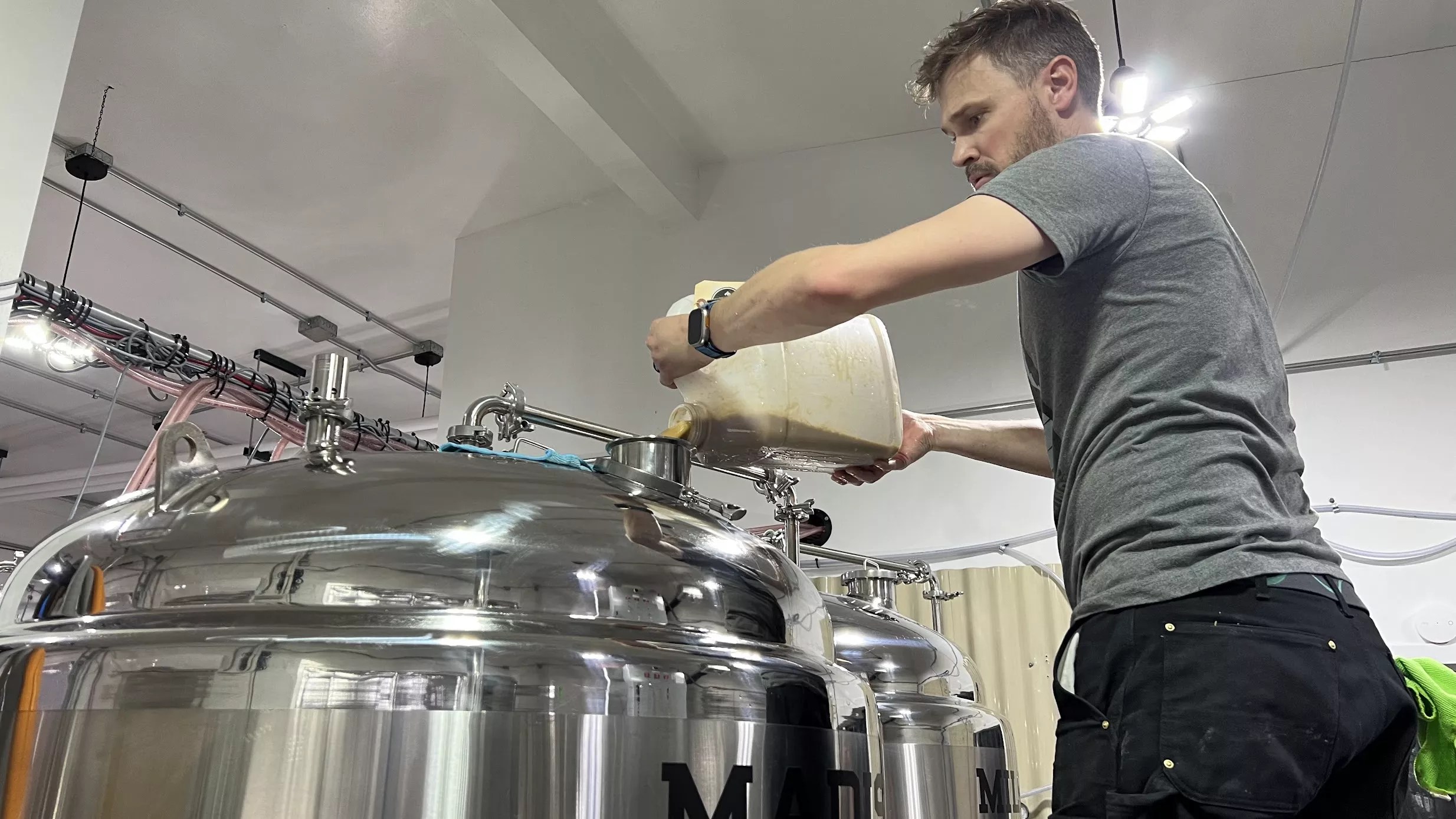 Sunroom’s Matthew Miller pouring Propagate yeast into the fermenter.