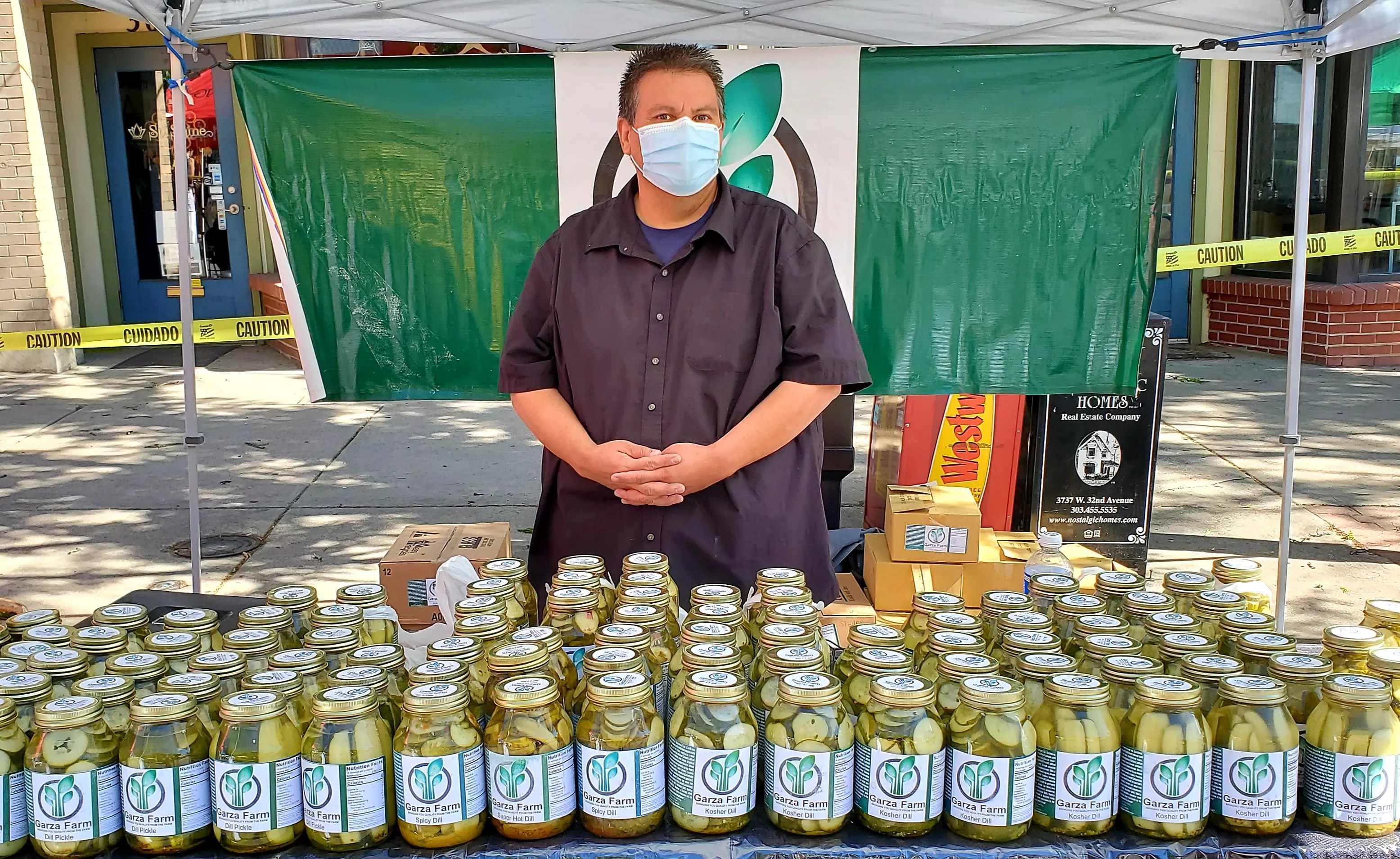Rick Garza sells his brother’s pickles at the Highland Farmers’ Market.
