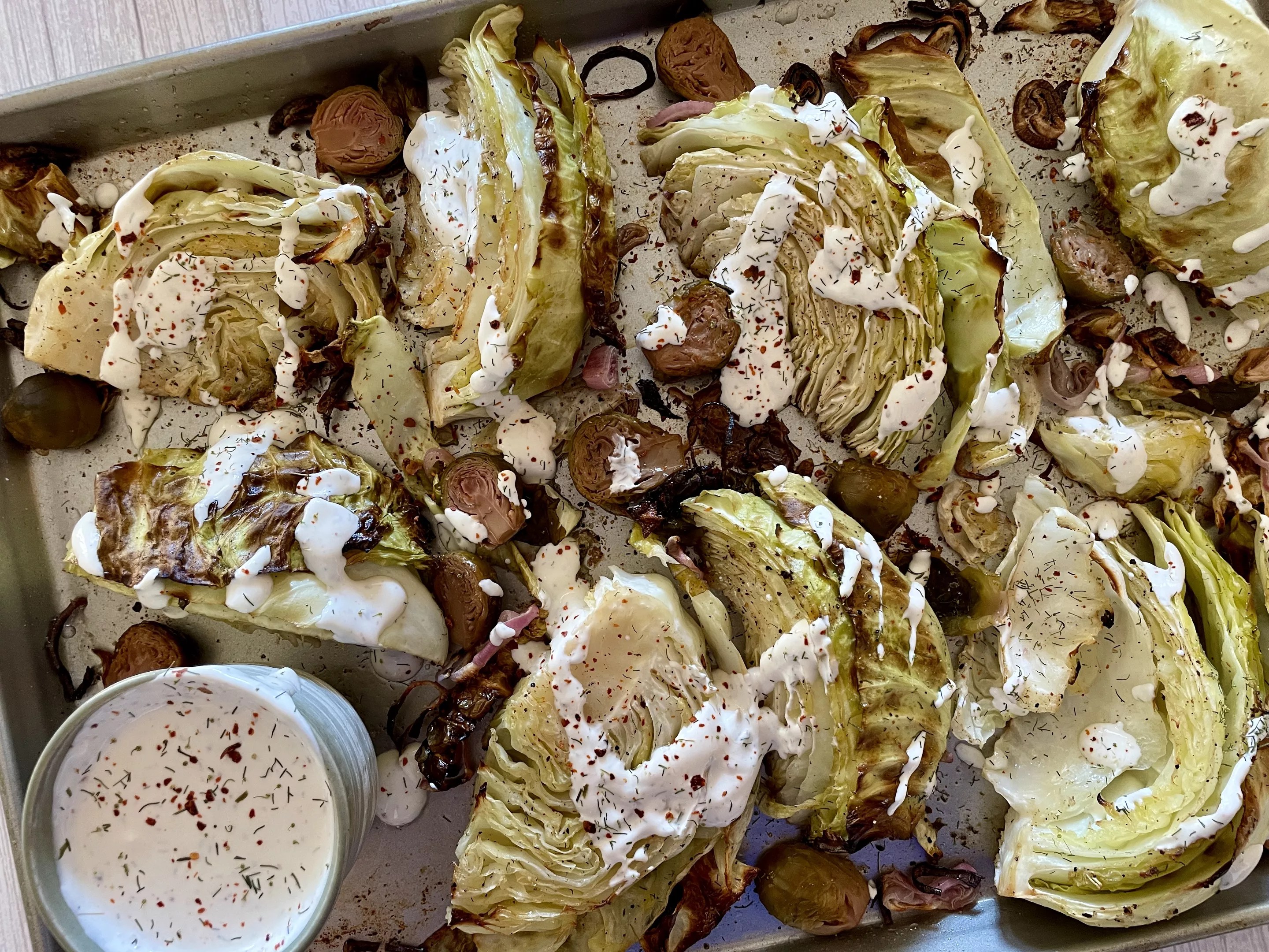 3. Once the vegetables are lightly charred, remove the sheet from the oven and let the cabbage cool slightly. You can serve the cabbage in wedges or cut out the core and cut it into slices. Drizzle the roasted vegetables with the creamy dill dressing, then garnish with a little extra dill and pepper flakes if desired before serving.