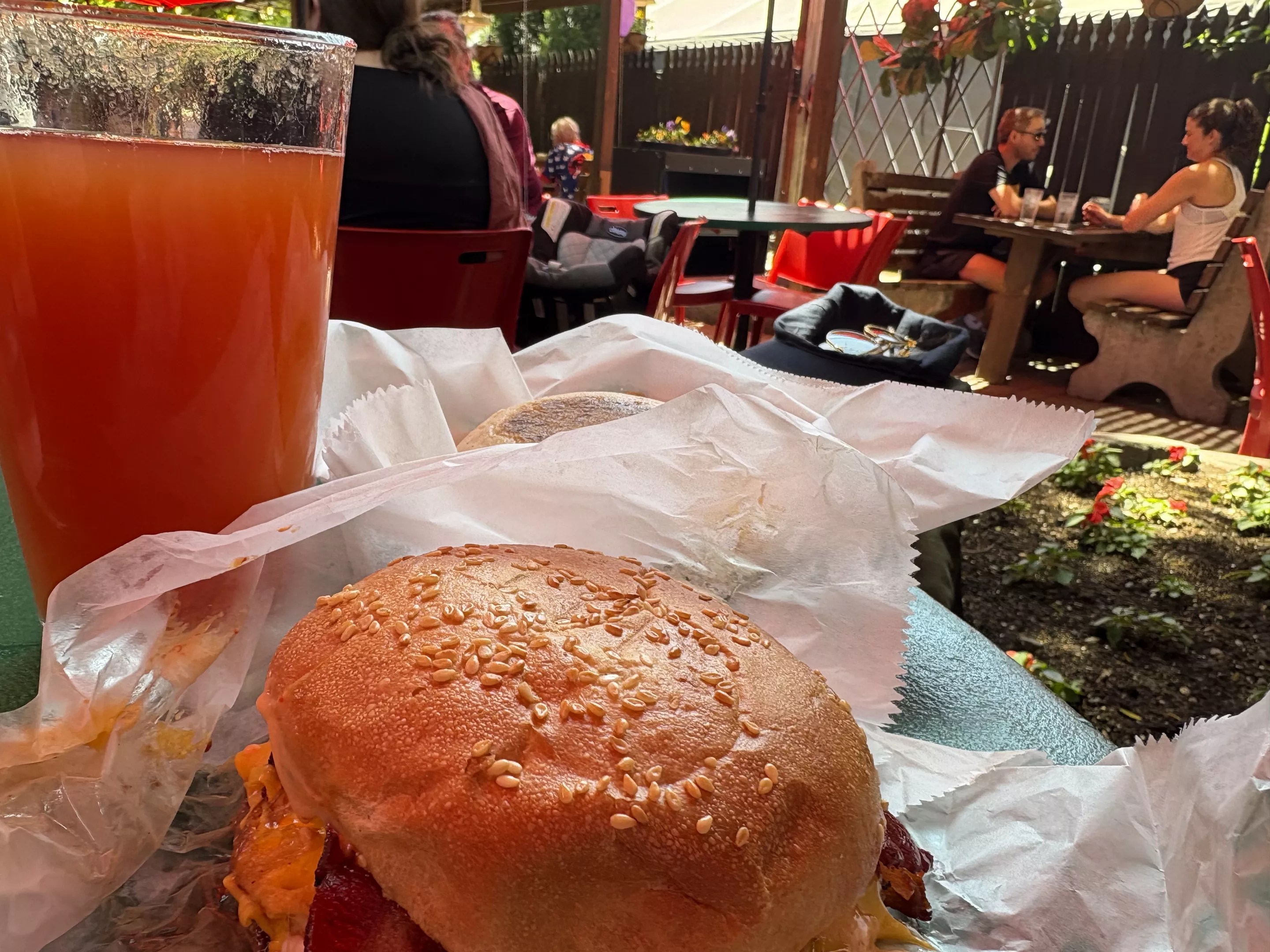 The breakfast burger, served on the patio.