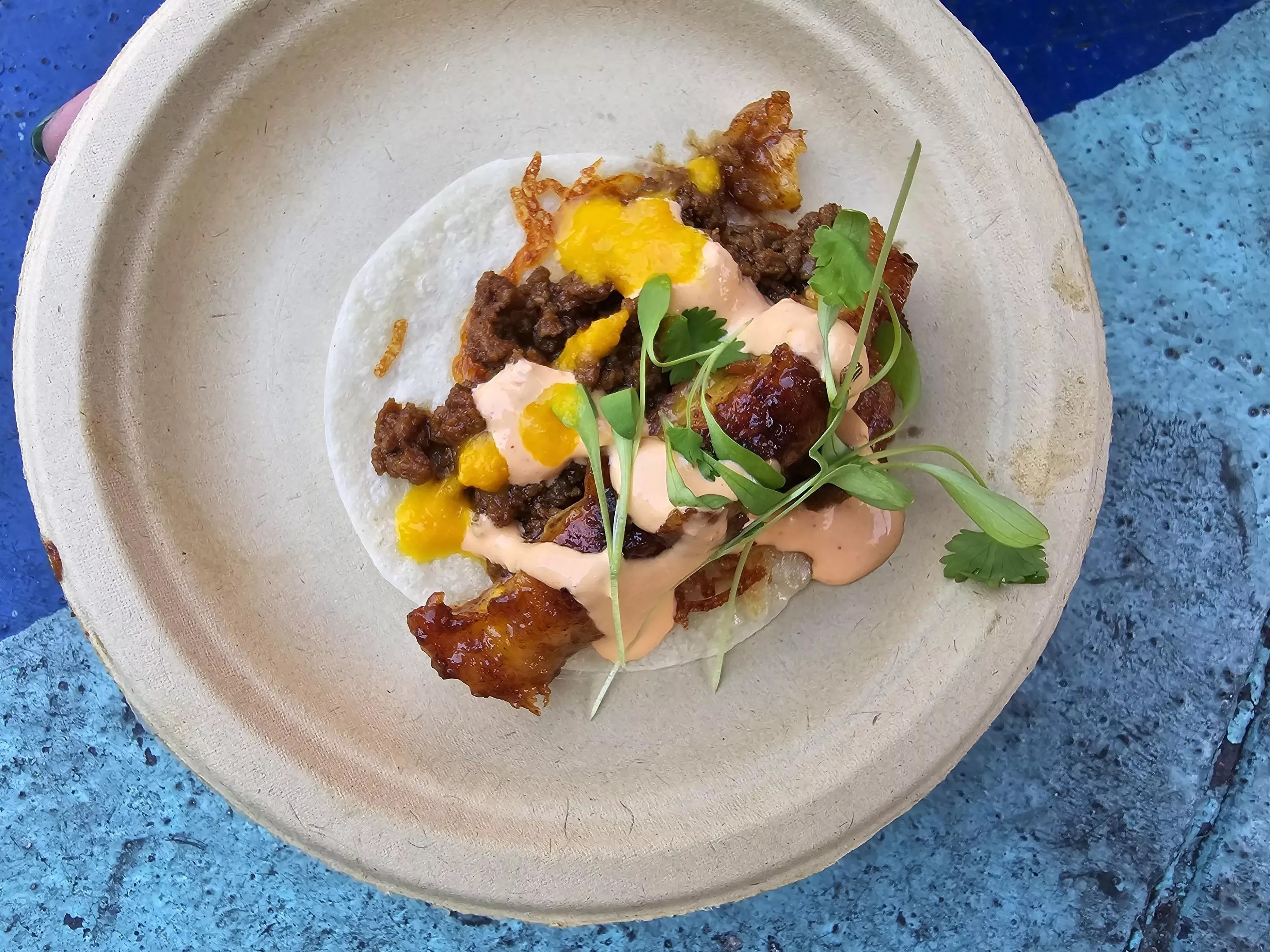 Food truck Uptown & Humboldt’s sweet and savory taco was a memorable bite: loaded with sofrito ground beef, fried cheese, sweet plantain, micro cilantro and red pepper crema on a flour tortilla.