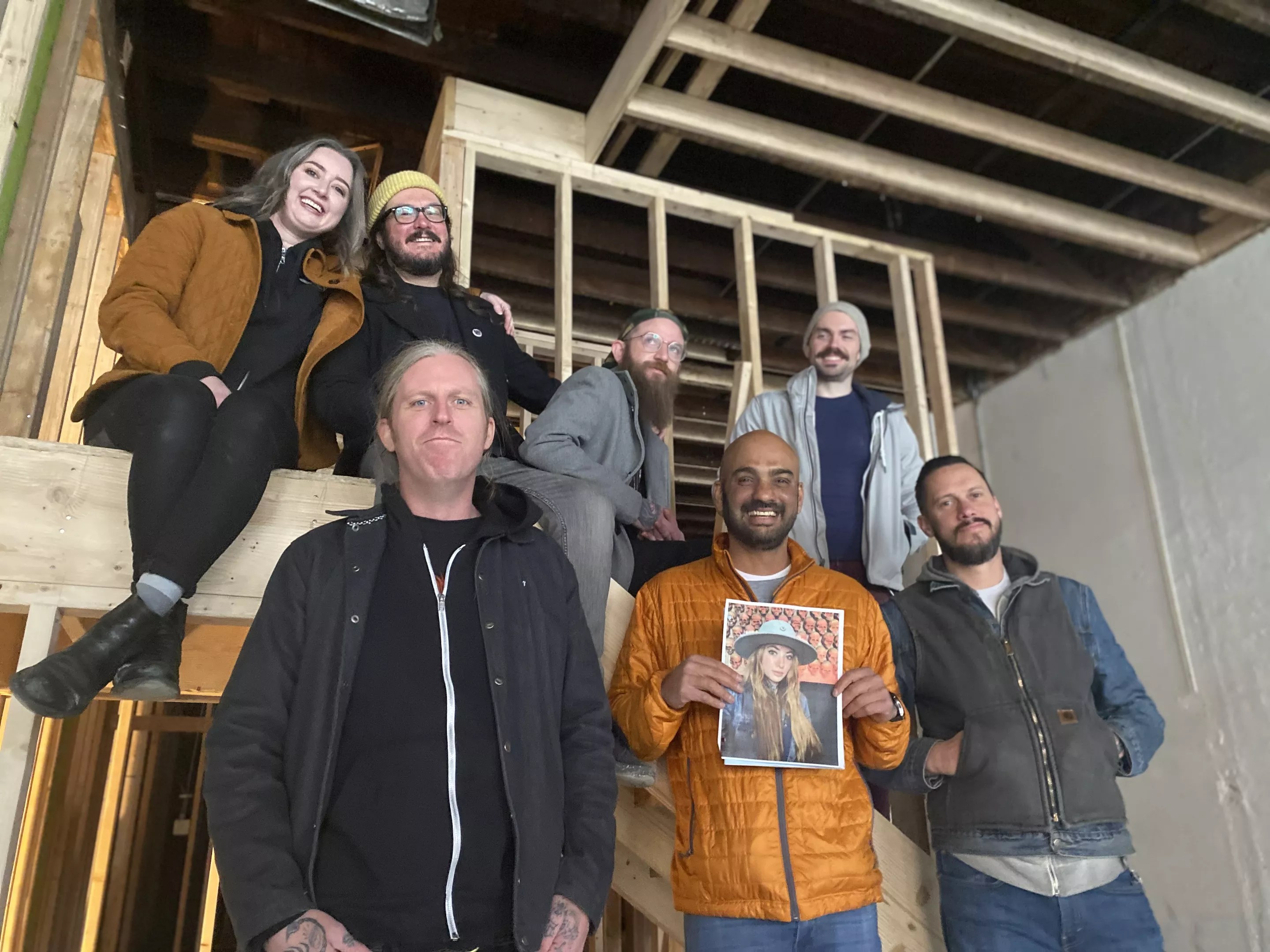 Sudhir Kudva, in orange, and his merry band of investors sit on the stairs that will soon lead to a rooftop deck at Marigold.