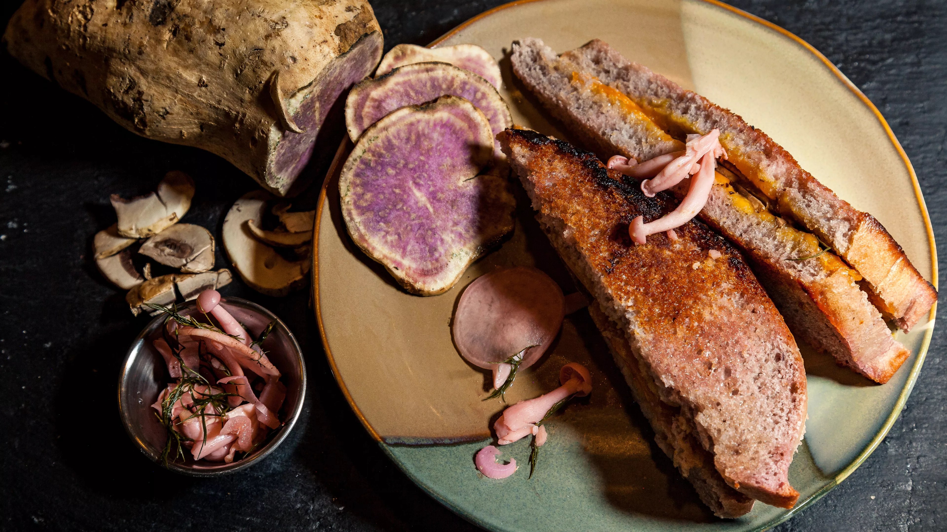 Snacktacular’s mushroom grilled cheese sandwich on housemade ube bread.