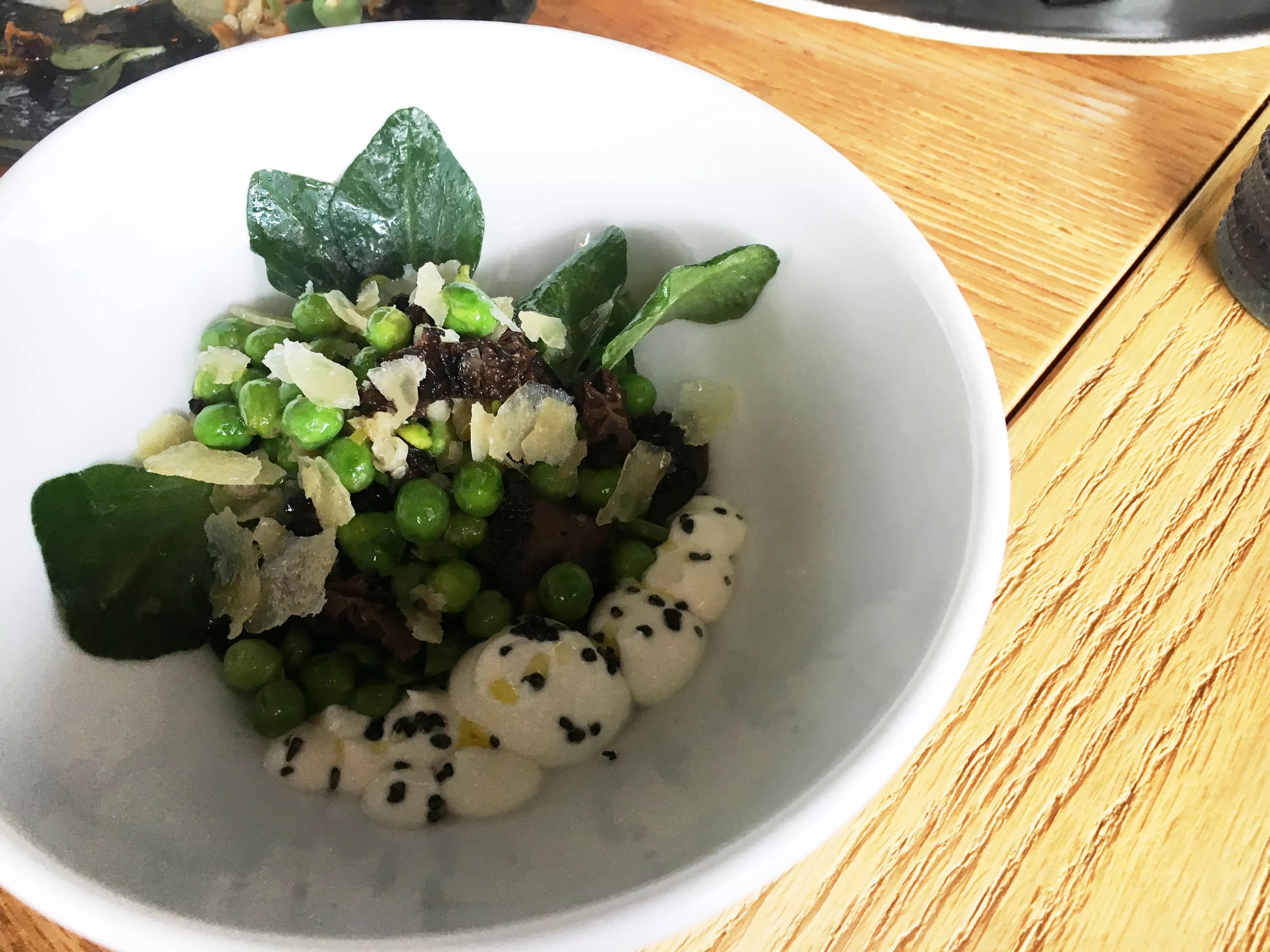 Fletter also manages the wine cellar and notes that the restaurant’s Corvin wine program allows guests to sample a range of vintage wines by the glass without paying for the whole bottle. He’ll most certainly have a few recommendations to go with Truett’s spring dishes. Hot-pink beet gnocchi come with golden-beet pur Mark Antonation Peas and foraged morels add to this warm salad at Hearth & Dram. Mark Antonation
