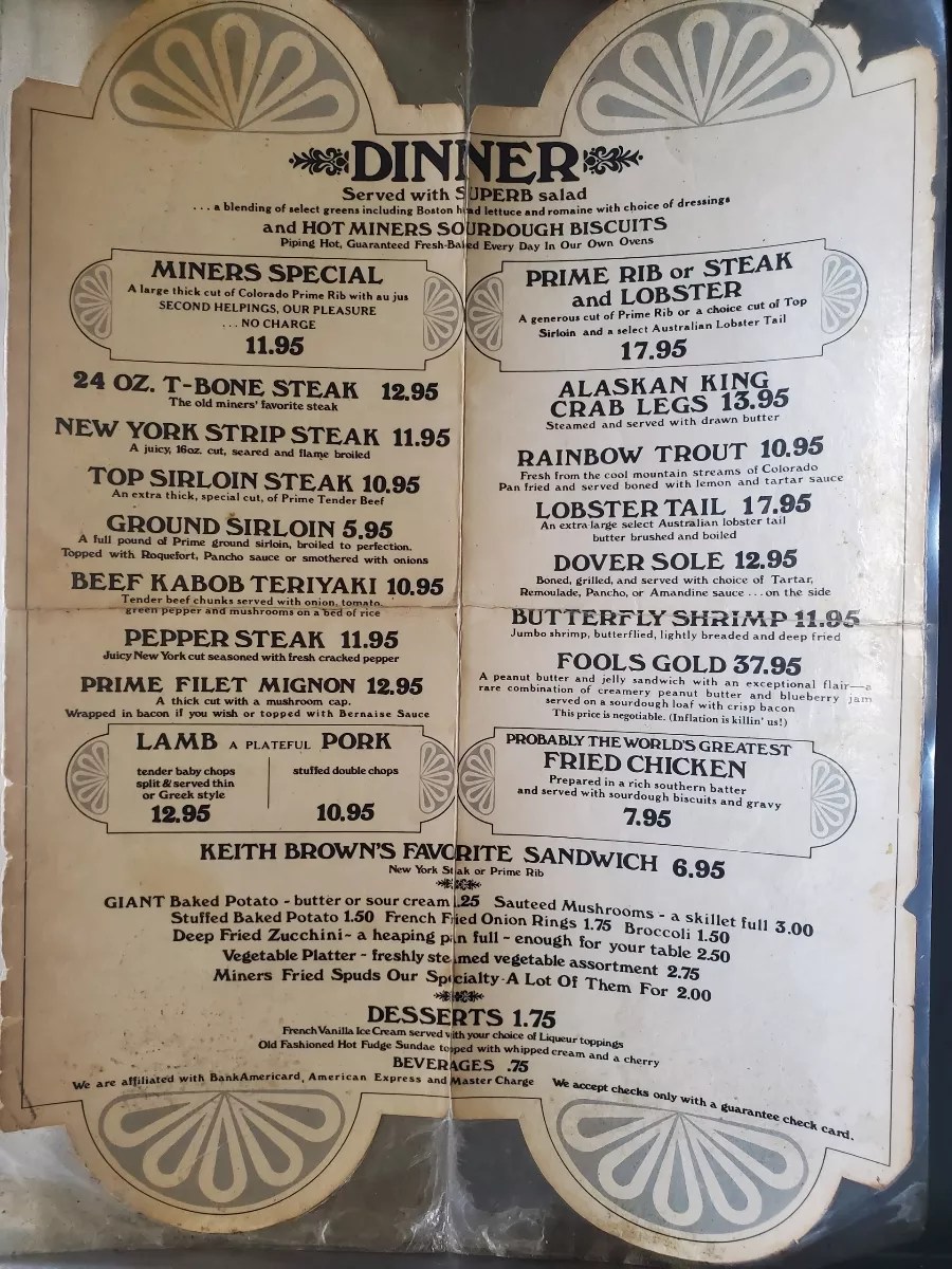 A Colorado Mine Company menu from its heyday in the 1970s.