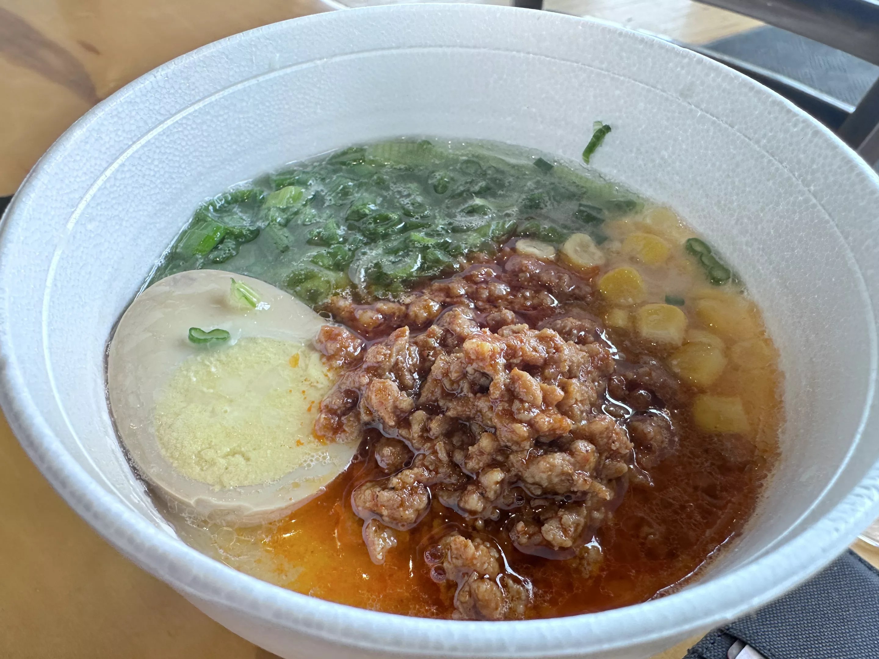 Tonkotsu ramen with pork, boiled egg, green onion and corn.