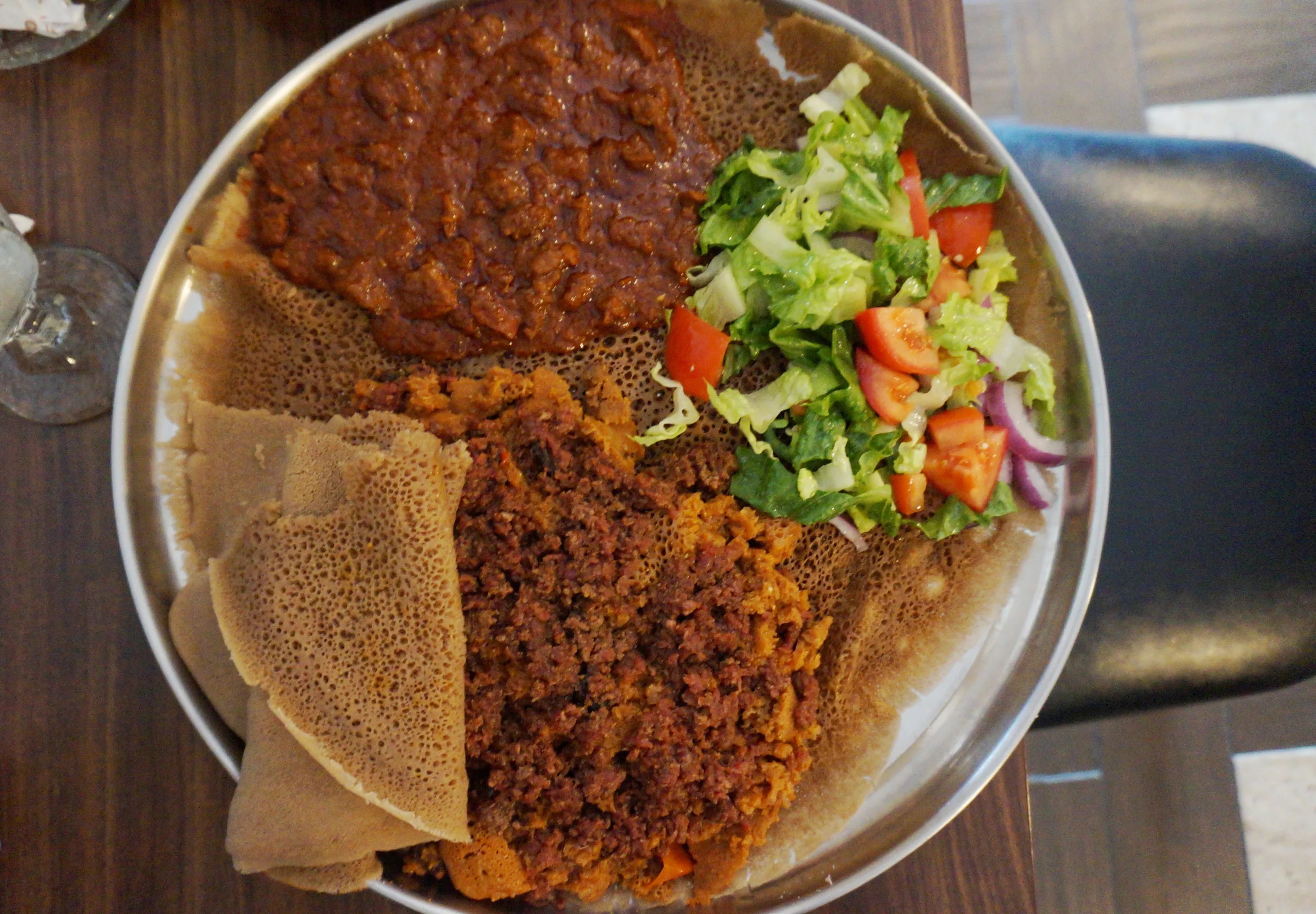 Stewed lamb (top) and a mixture of seasoned ground beef and dried beef (bottom) form a filling meal atop injera bread.