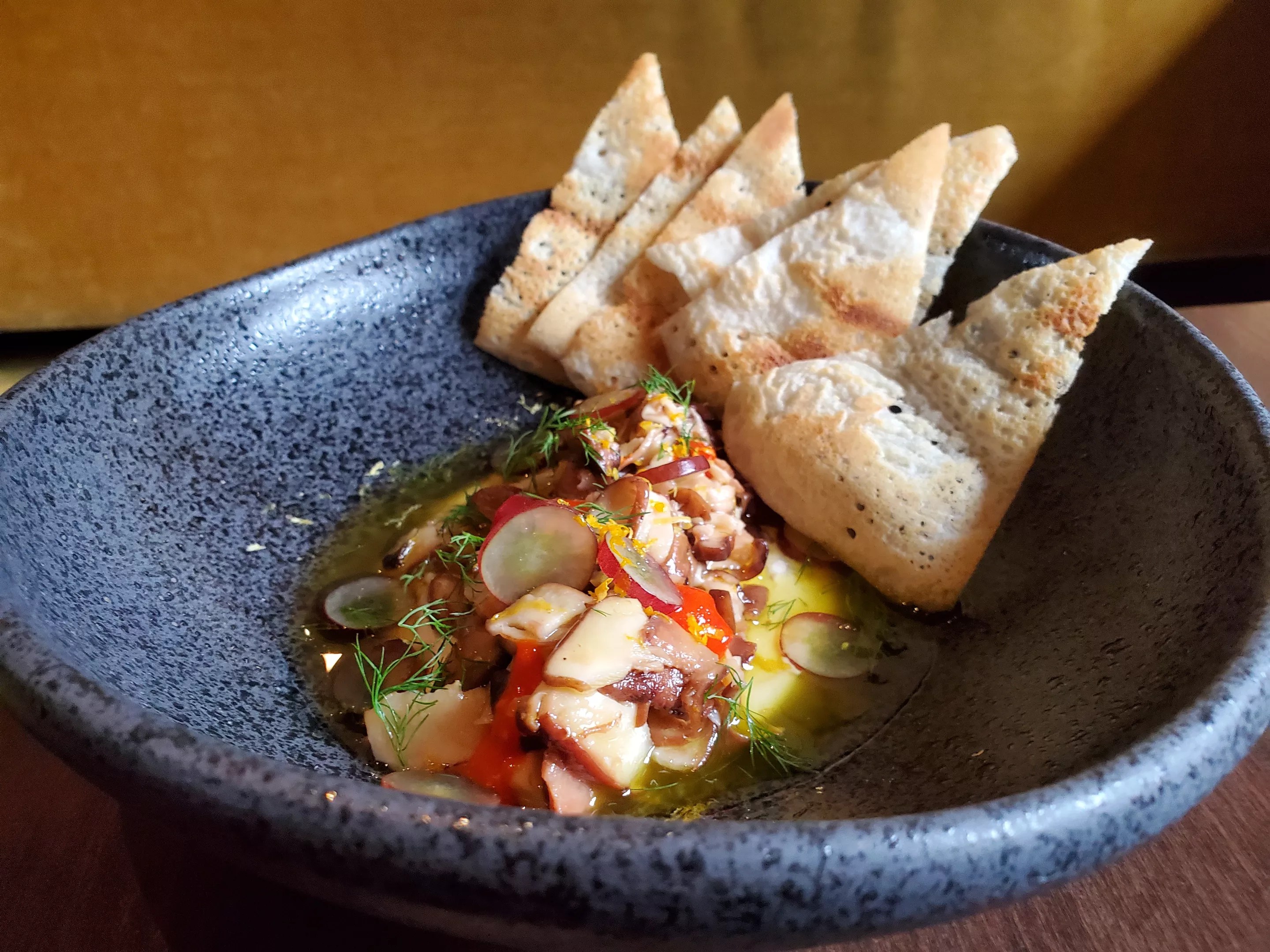 Mixing elements like salt, heat, acid and sweetness, Tapia and his team have created a menu that’s full of unexpected hits. There’s a play on crudo ($12) made with the unique combination of shiitake mushrooms and thinly sliced grapes for a deeply savory bite balanced by sweet bursts. The dish is doused in spicy oil and served with thin, crispy chips made from the dosas served at breakfast and lunch.