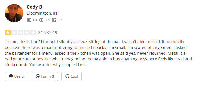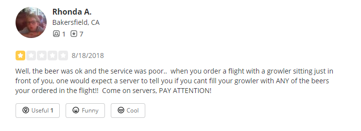The Lesson: Sure, many an attentive server will notice an empty growler and associate the sample order with that growler, telling you what is available to go in case you want to line that up with your samples. Many breweries will simply list what is available to go on their menu (it’s unclear if Locavore did). But if the brewery truly failed to do these two things, all the customer had to do was ask what was available to go. The customer is just as lax as the server, but the brewery ends up with a one-star review here, over a very minor infraction.