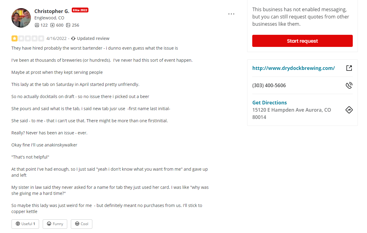 Aurora’s Dry Dock Brewing Company has been a Colorado mainstay for nearly two decades, but this person didn’t hesitate to leave it the worst possible rating based on one small interaction.