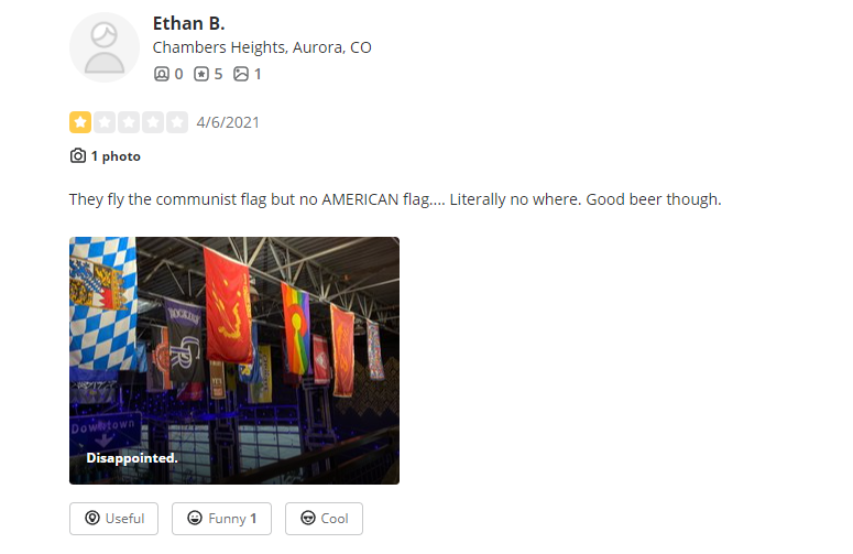 For those unfamiliar, the flag referred to represents local standout Comrade Brewing, which Bierstadt has collaborated with on multiple occasions. At least Ethan liked the beer though.