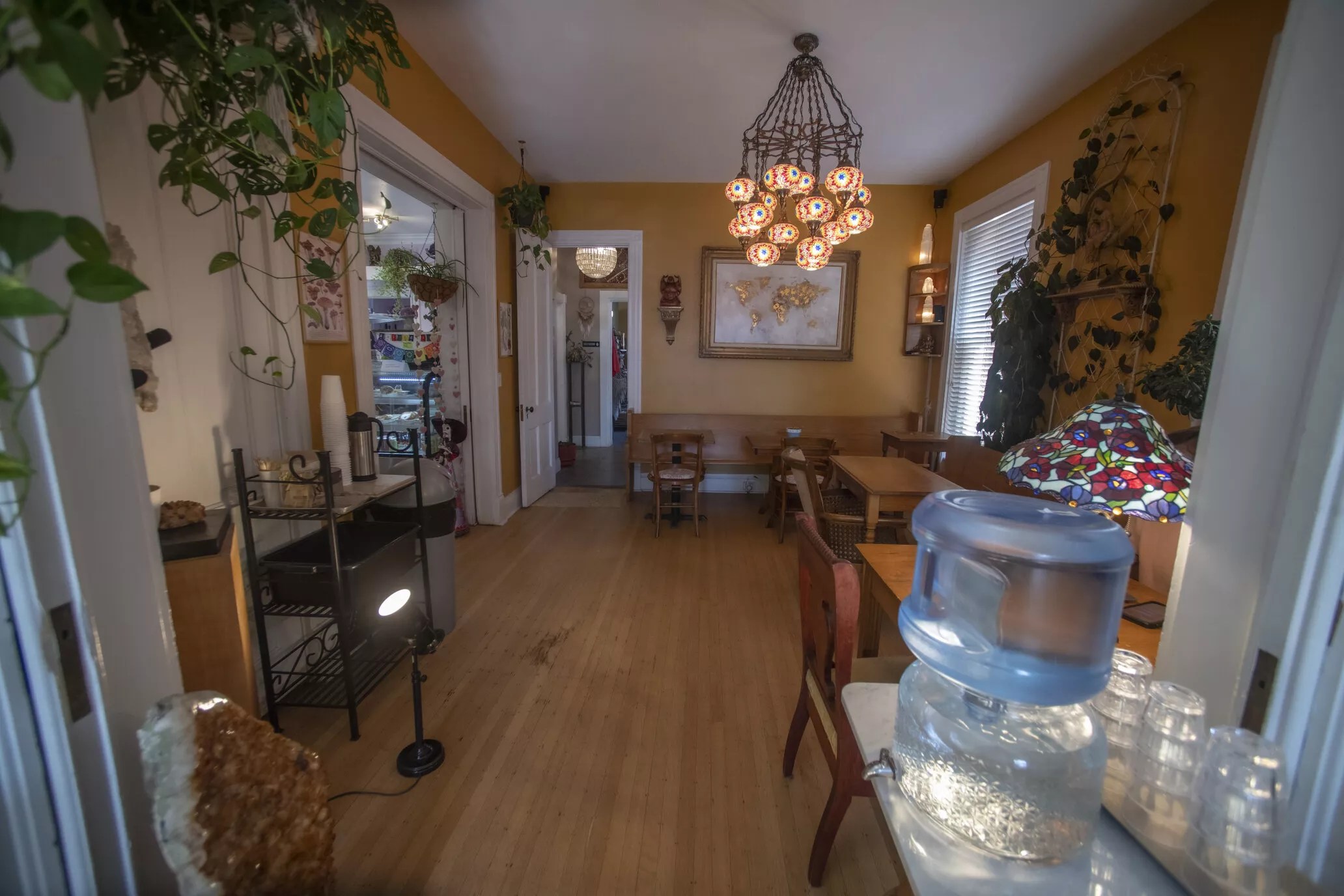 The walls are adorned with Balinese, Oaxacan and Peruvian art that Richmond collected over years of travel. Turkish chandeliers and mushroom lamps give it an eclectic and comfortable feeling, like being inside of someone’s home. There are also goods and imports for sale, such as crystals, gems, mala beads and other handmade items.
