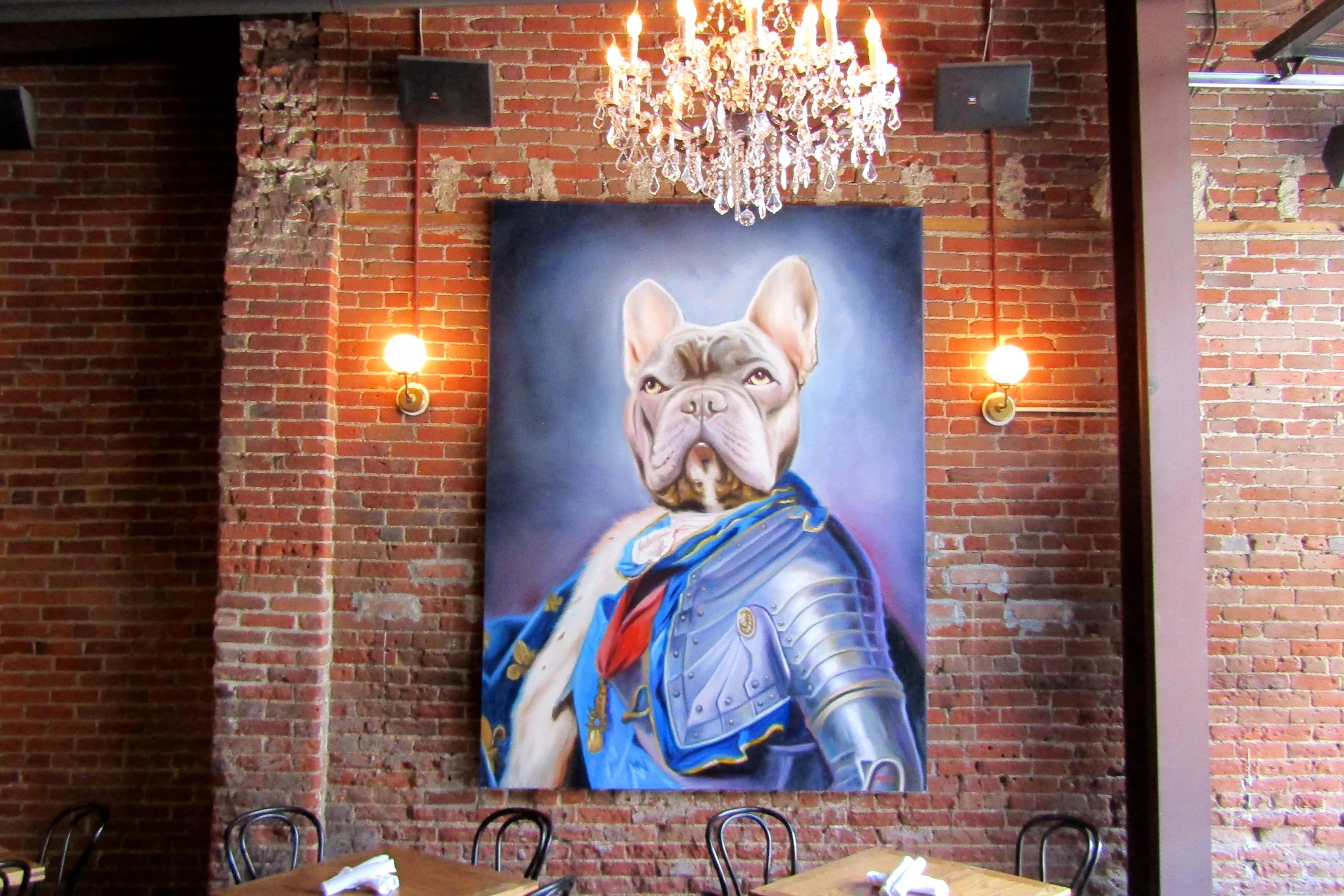The French theme continues in the crystal chandeliers, vintage hearth and mural-sized painting of Neri’s French bulldog, Louie. Neri and Feeley worked with painter Patrick McGregor to come up with the artwork, which depicts a noble canine dressed in royal garb.