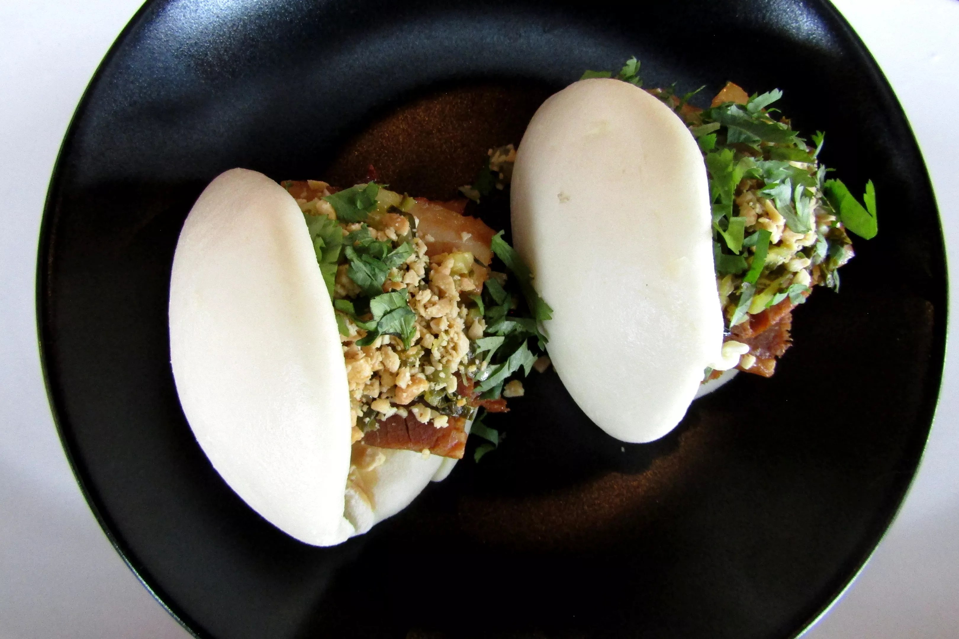 Pork-belly buns with pickled mustard greens, peanuts and cilantro.