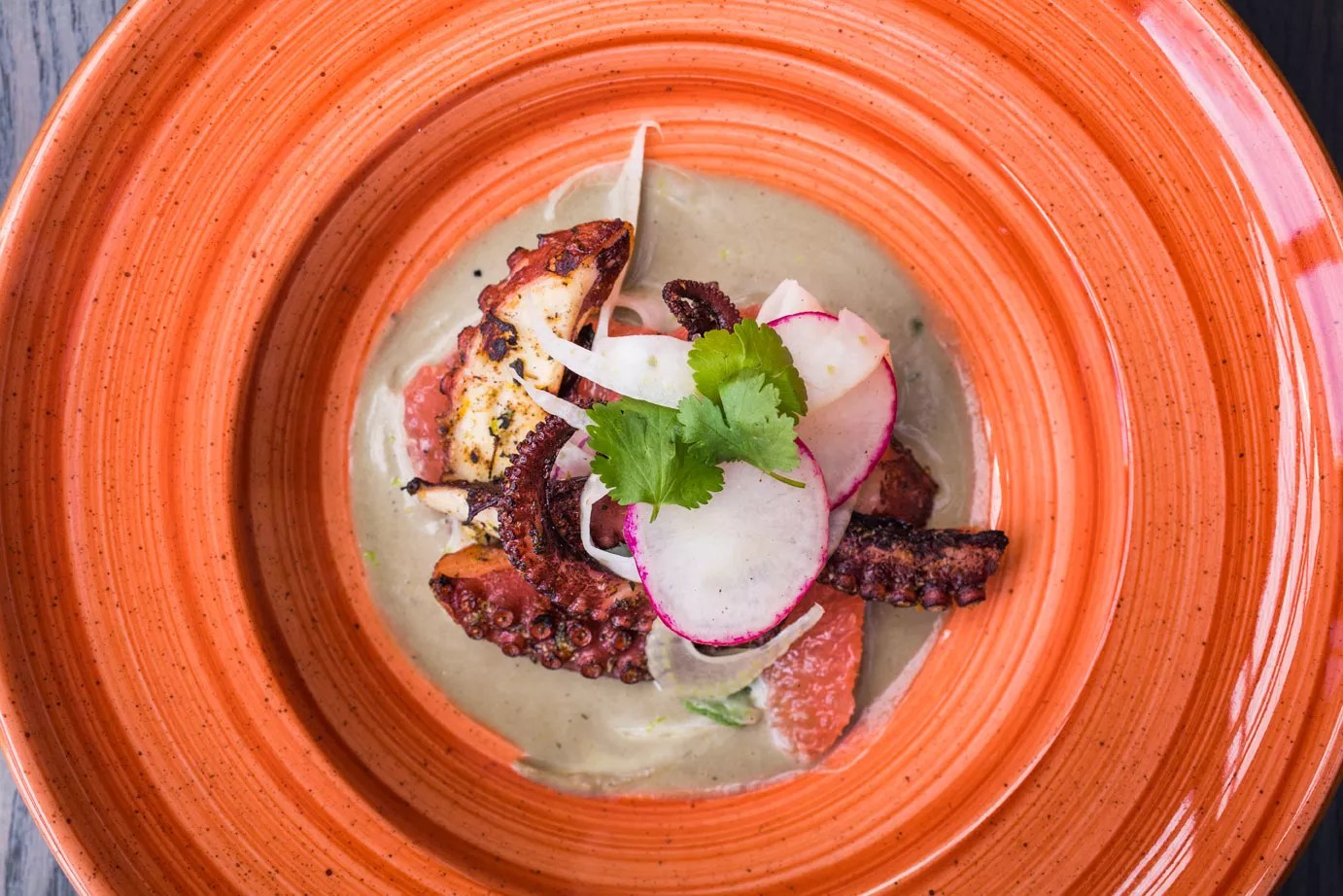 Start with pulpo a la parrilla (grilled octopus), with charred, coin-sized slices of octopus and a salad of fennel ribbons entwined with grapefruit. The brightness comes in waves: citrus-marinated octopus; dressing with juiced lemons, limes and oranges; and grapefruit carefully relieved of bitter pith and membranes to reveal its inner sweetness. Chicken tinga is nicely nuanced thanks to its tomato-guajillo sauce. Elote, reinterpreted as white grit cakes rather than street-style corn on the cob, is cut into logs and exquisitely fried, golden on the outside, creamy within. Swirl them in the requesón, a thin Mexican ricotta, and the grayish-green huitlacoche-butter sauce that mingle artfully on the plate.