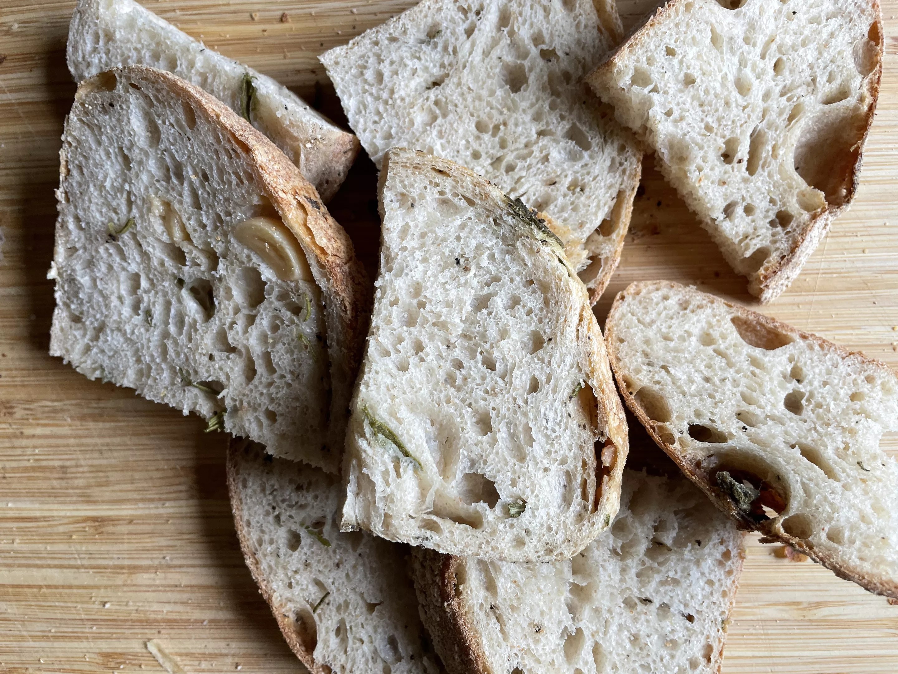 The Nonna G sourdough is filled with whole cloves of roasted garlic and herb leaves.